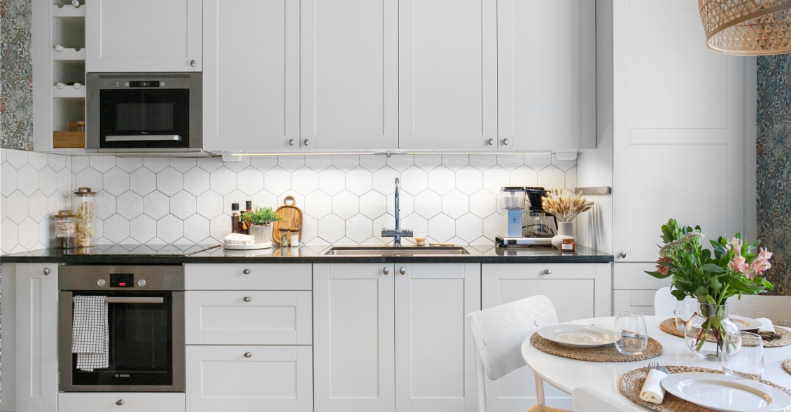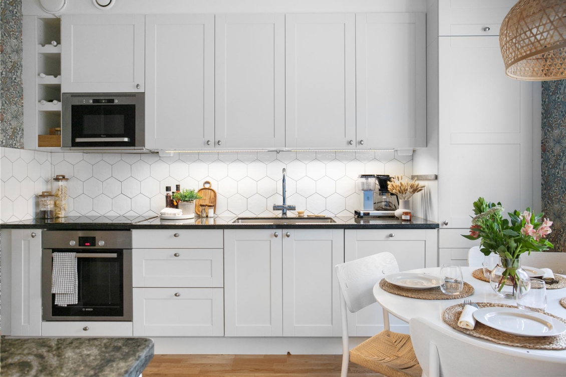 Modernt kök från Marbodal i delvis öppen planlösning mot vardagsrummet, här finns det gott om plats för ett matbord. Skåpsfronterna är ljusa med bänkskiva av sten och ljust kakel ovan. Den maskinella utrustningen består av; Kyl/frys, spishäll, ugn, fläkt, Integrerad diskmaskin och mikro.