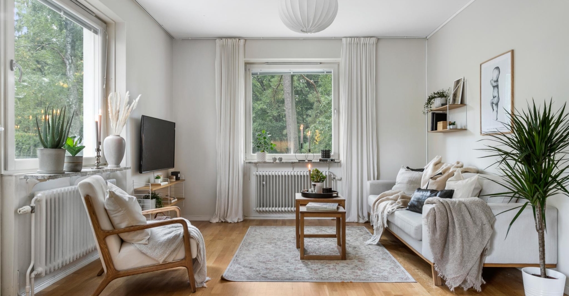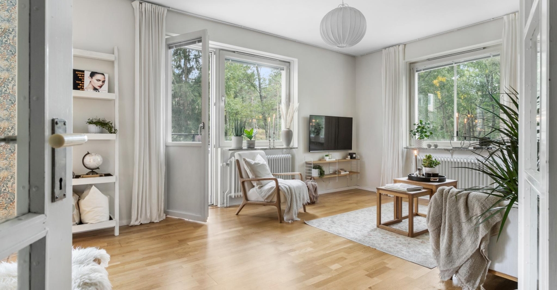 Ljust och luftigt vardagsrum i gavelläge med delvis öppen planlösning som rymmer både soffgrupp och mediamöbel. Från vardagsrummet nås balkongen.