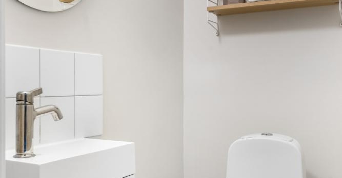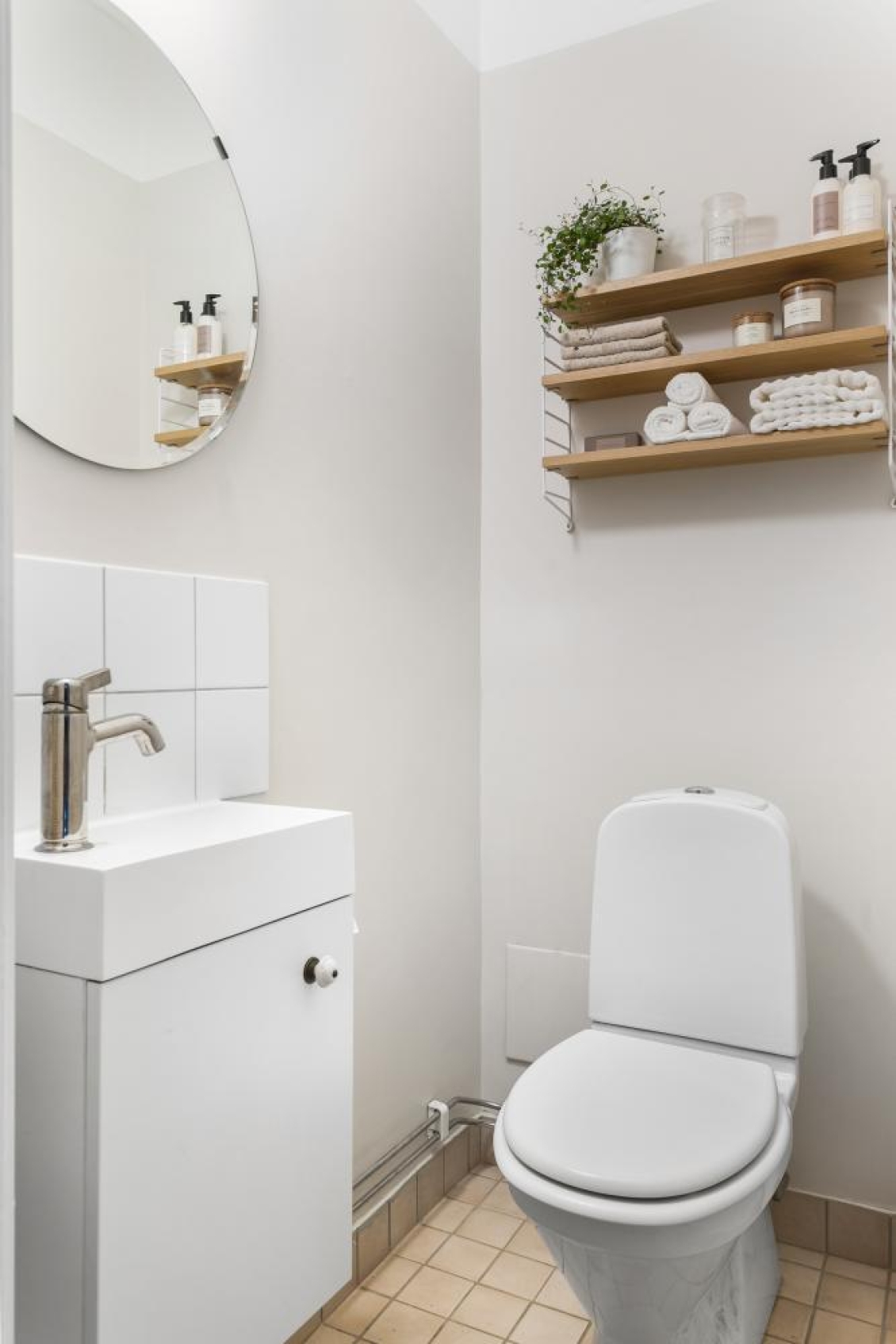 Badrum med kaklade väggar och golv från stambytet 2006. Här finns dusch, handfat med kommod, spegel och tvättmaskin. Separat WC finns i hallen.