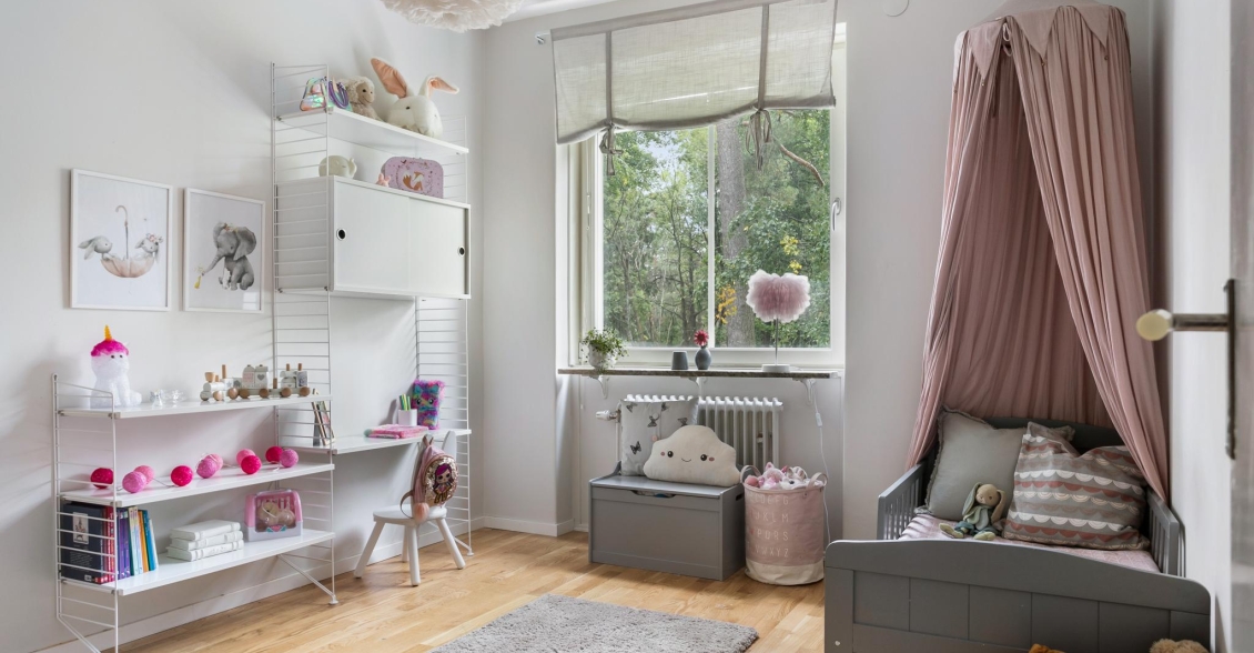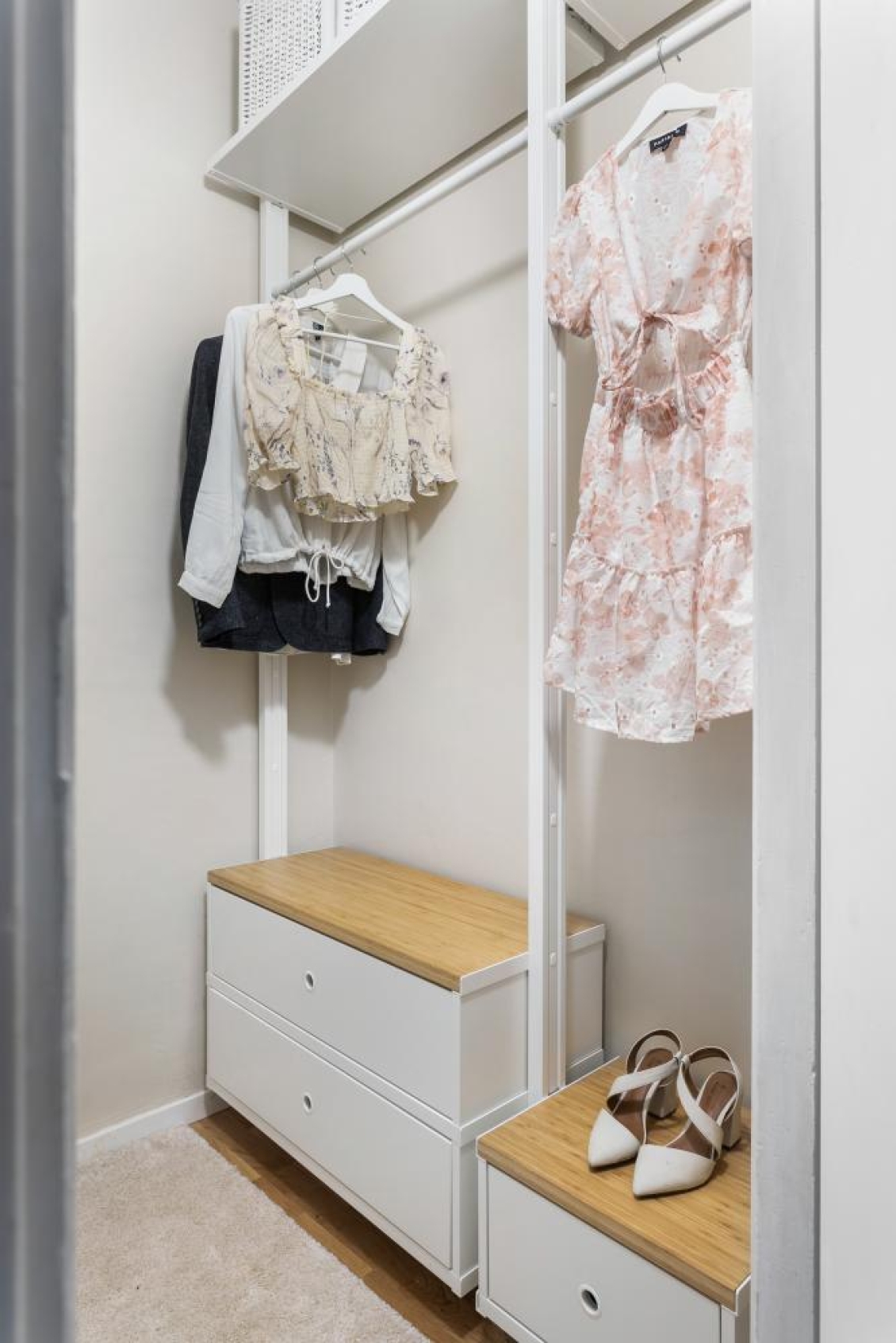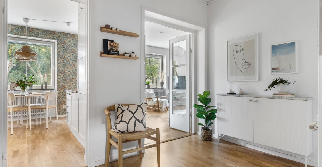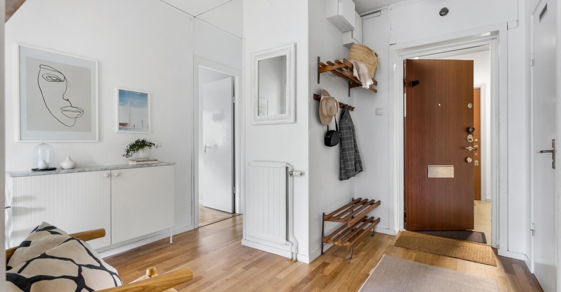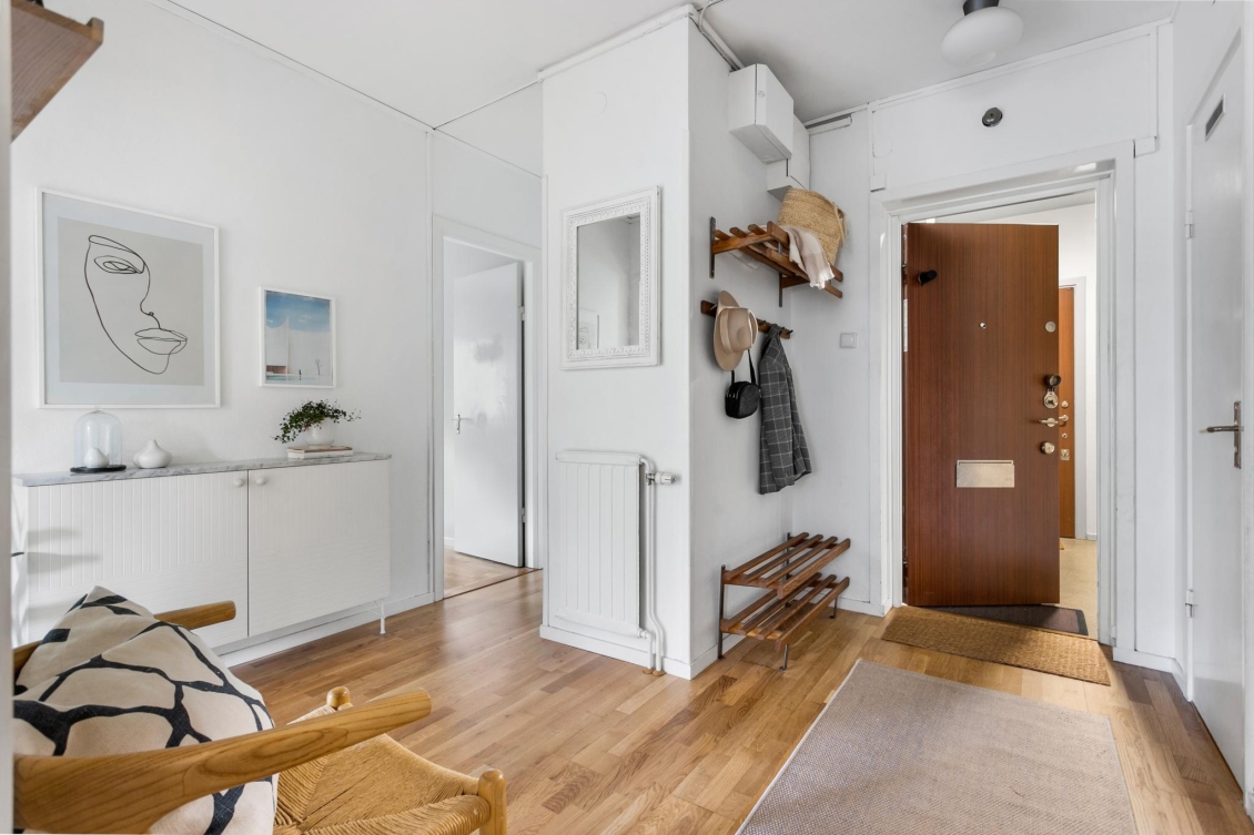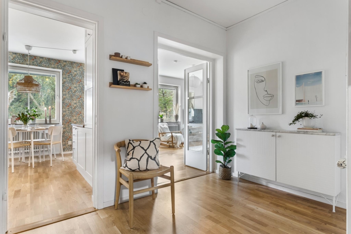 Välkomnande och rymlig entré med plats för avhängning av skor och ytterkläder innanför dörren. Gott om förvaring i klädkammare. Här ligger ett fint parkettgolv som sedan fortsätter genomgående i hela bostaden.