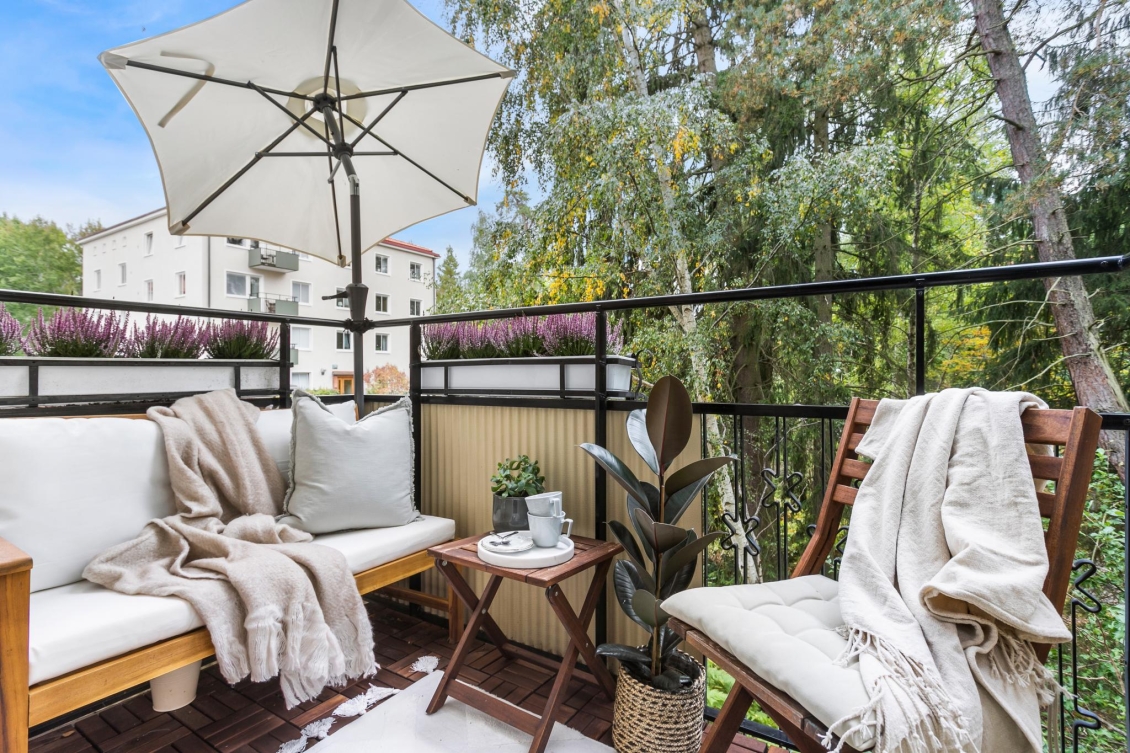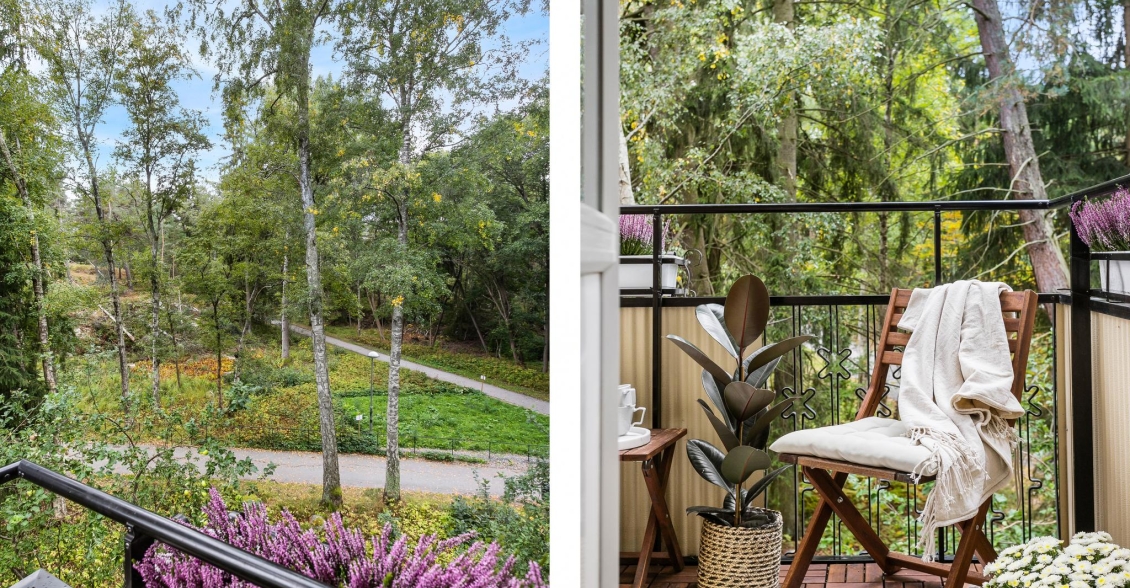 Trevlig och stor balkong i soligt läge med vy över lummigt skogsparti. Här finns plats för cafébord och mindre lounge grupp.