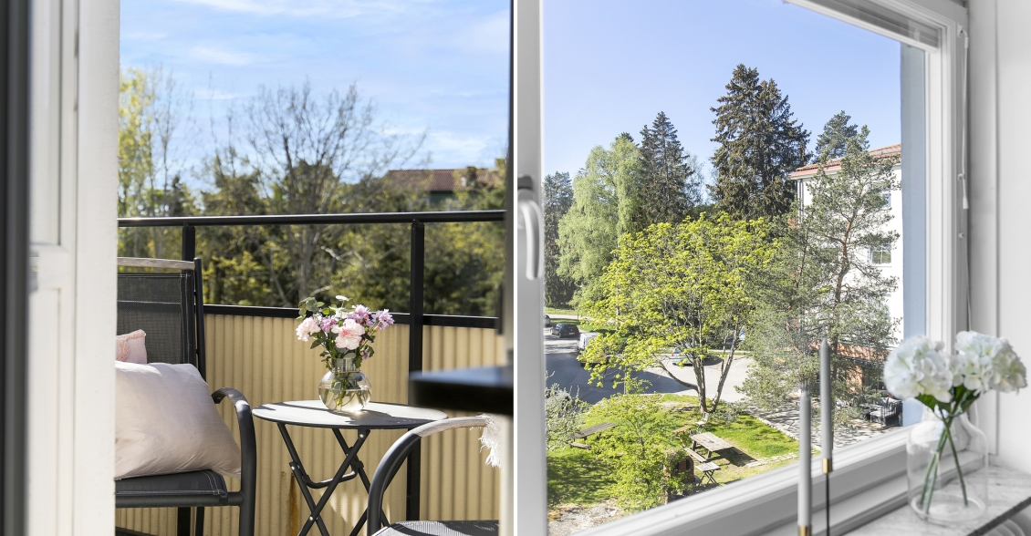 Mycket trevlig balkong i väst med eftermiddags-/kvällssol. Fina vyer över naturmark. Plats för blommor, café bord och stolar.