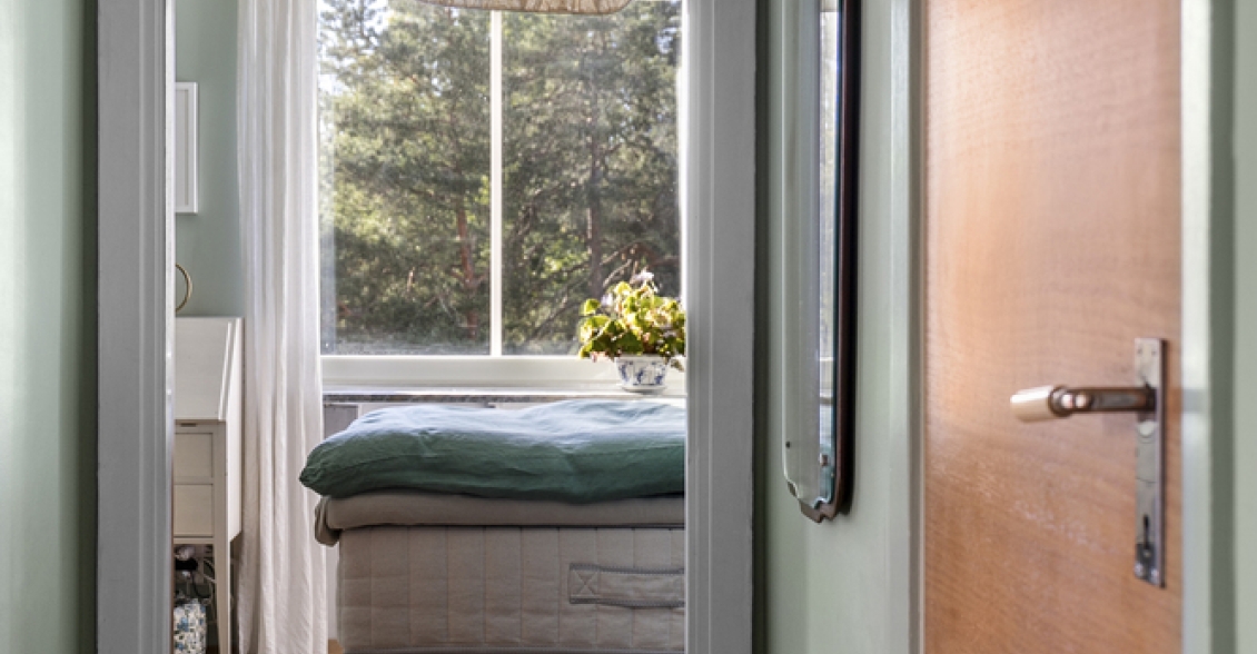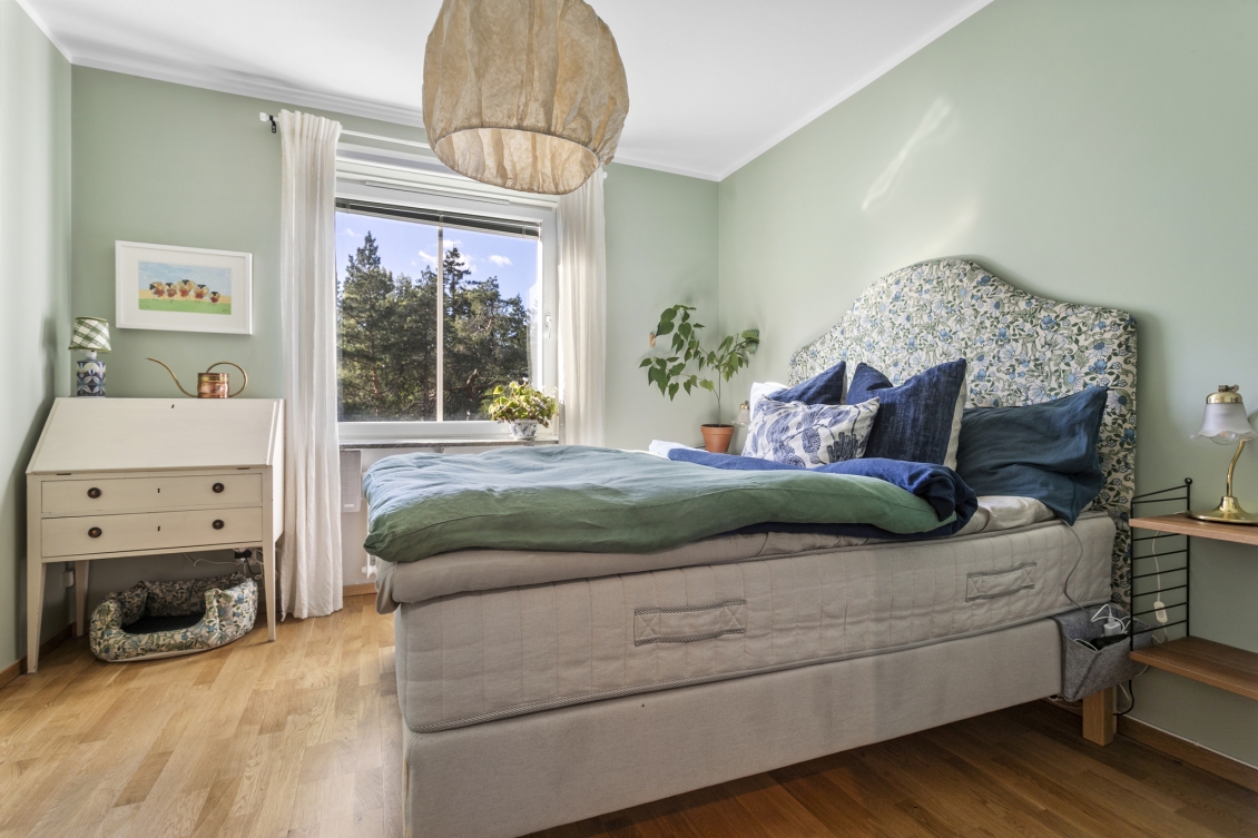 Ljust och trevligt sovrum med fönster i väst. Gott om plats för dubbelsäng och sängbord. Förvaring finns i form av inbyggd garderob.