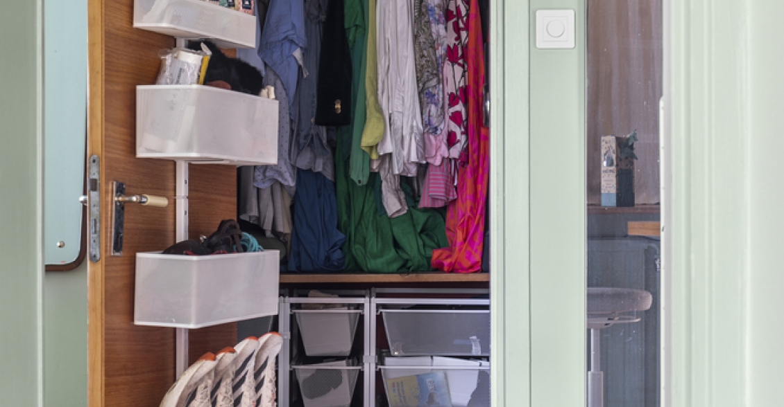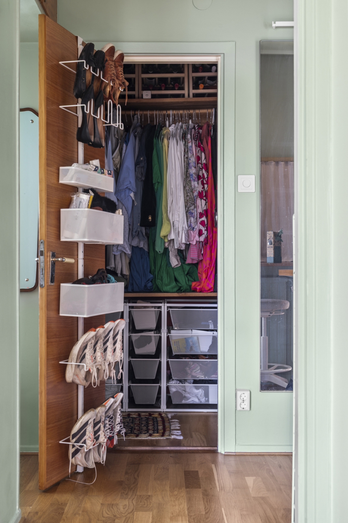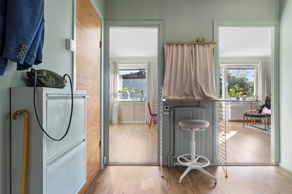 Välkomnande hall med gott om utrymme för avhängning samt förvaring i den rymliga klädkammaren. Hallen går i vinkel mot sovrummet och det finns ytligare förvaring i form av två platsbyggda överskåp vid ingången till sovrummet. Parkettgolv genomgående.