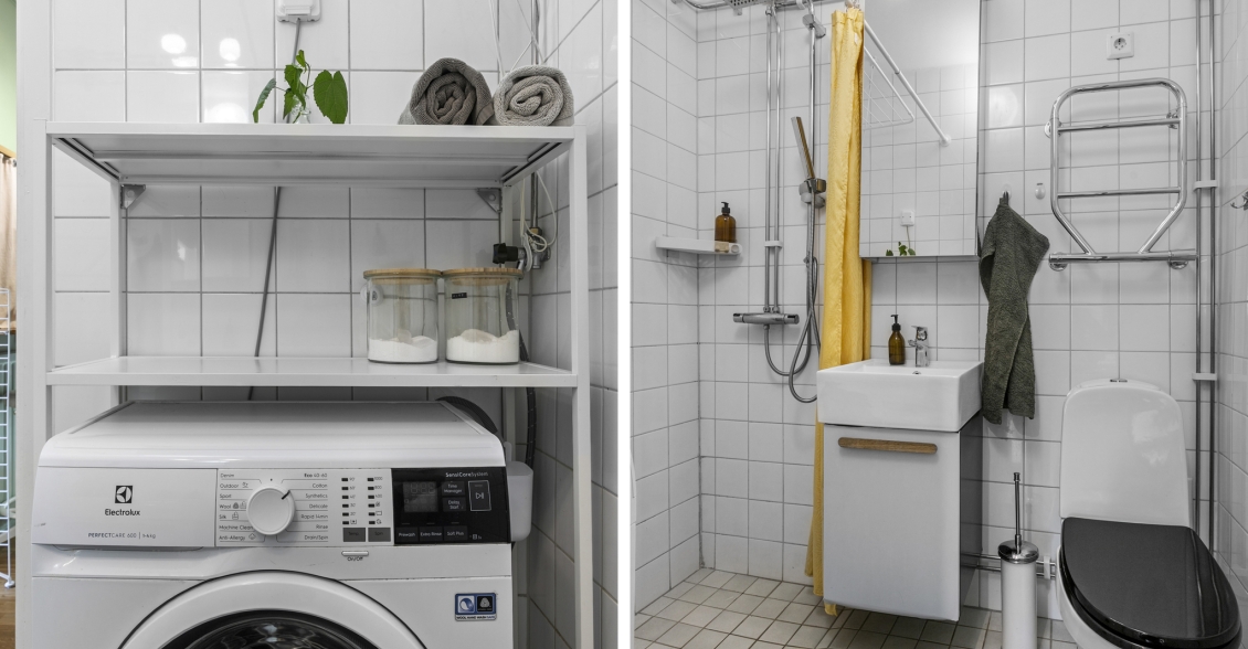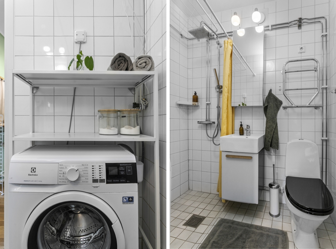 Helkaklat badrum i vitt och grått från föreningens stambyte 2007. Här finns dusch, wc, handfat, spegelskåp, handdukstork och en tvättmaskin. Klädvård kan du även sköta enkelt i föreningens moderna och välskötta tvättstuga som ligger i huset bredvid.