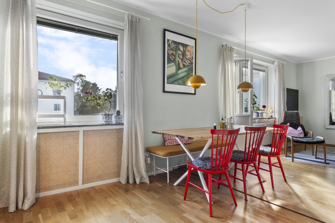 Stort vardagsrum i gavelläge med fönster i två väderstreck och fantastiska vyer över området runt föreningen och ett lummigt skogsområde. Detta rum har ett fantastiskt ljusinsläpp och på balkongen kan du njuta av sol från lunch till sen kväll. Vardagsrummet erbjuder gott om plats för soffgrupp och förvaringsmöbler.