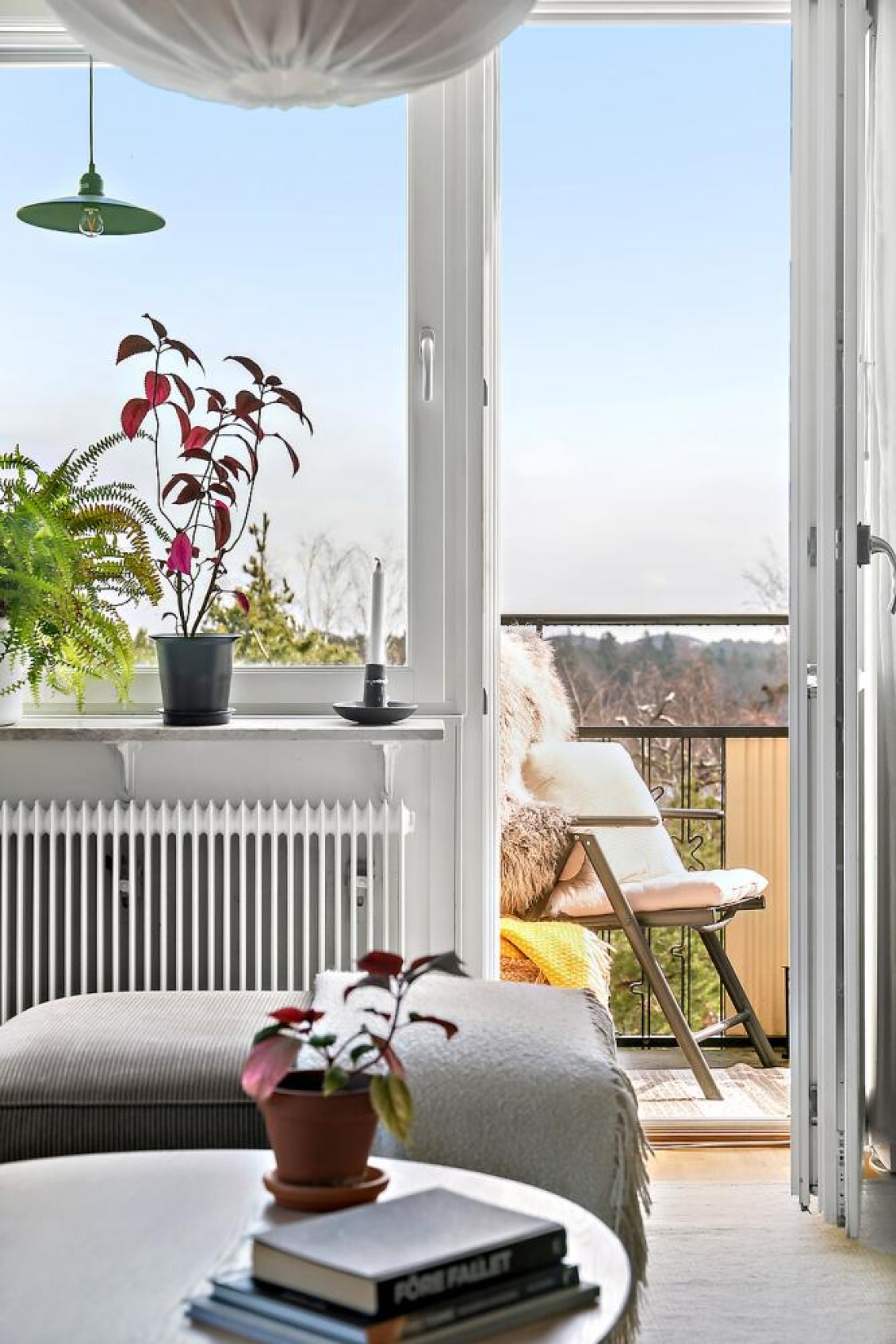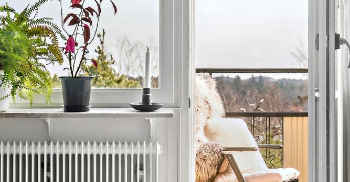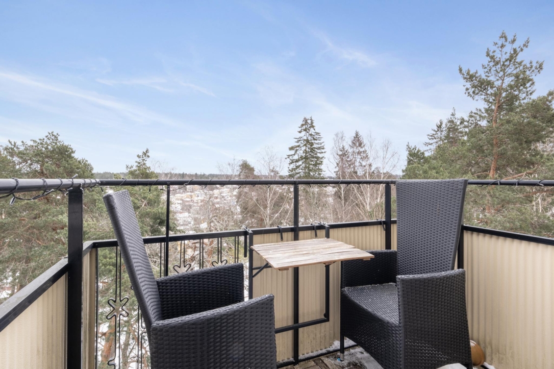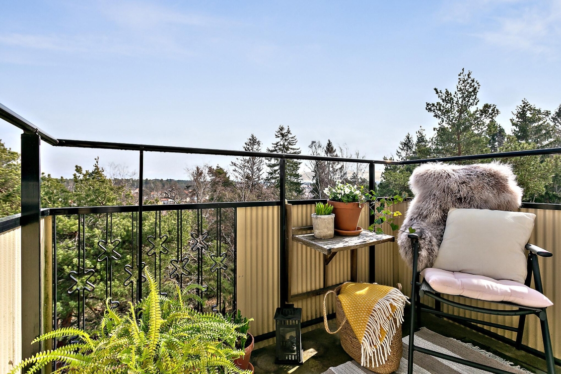 Solig balkong i sydostläge med fri utsikt över trädtopparna, naturmarken och det charmiga villaområdet nedanför. Här finns gott om plats för möbler, växter och avkoppling – en perfekt plats för morgonkaffet eller en lugn stund i solen.