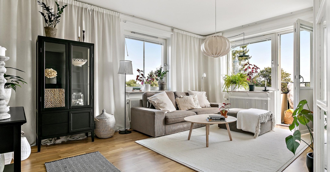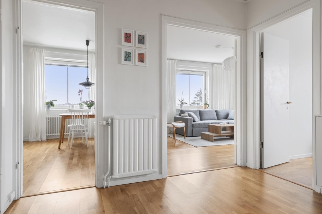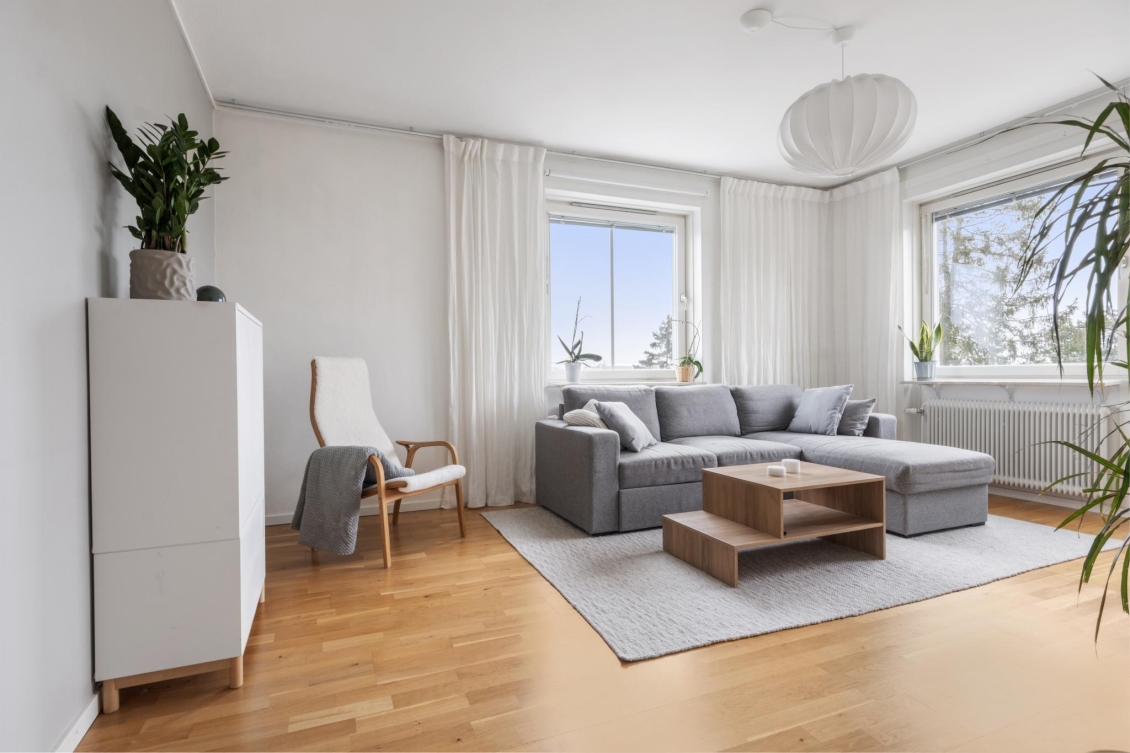 Ett ljust och inbjudande rum i förmånligt gavelläge med generöst ljusinsläpp från två väderstreck. Härifrån har du en vacker utsikt över naturmarken och Globen i fjärran. Rummet erbjuder gott om plats för både soffgrupp, mediemöbel och matplats för större sällskap. Från vardagsrummet nås den soliga balkongen – en rofylld plats att njuta av utsikten över trädtopparna och villaområdet nedanför.