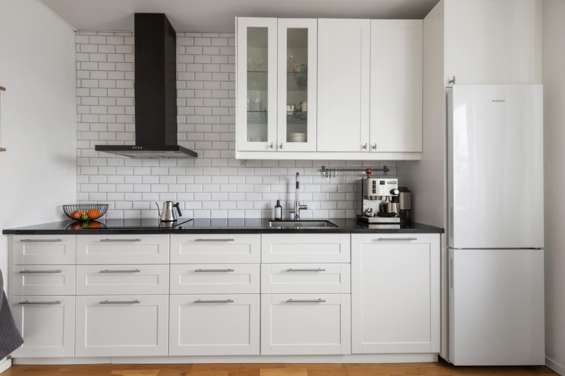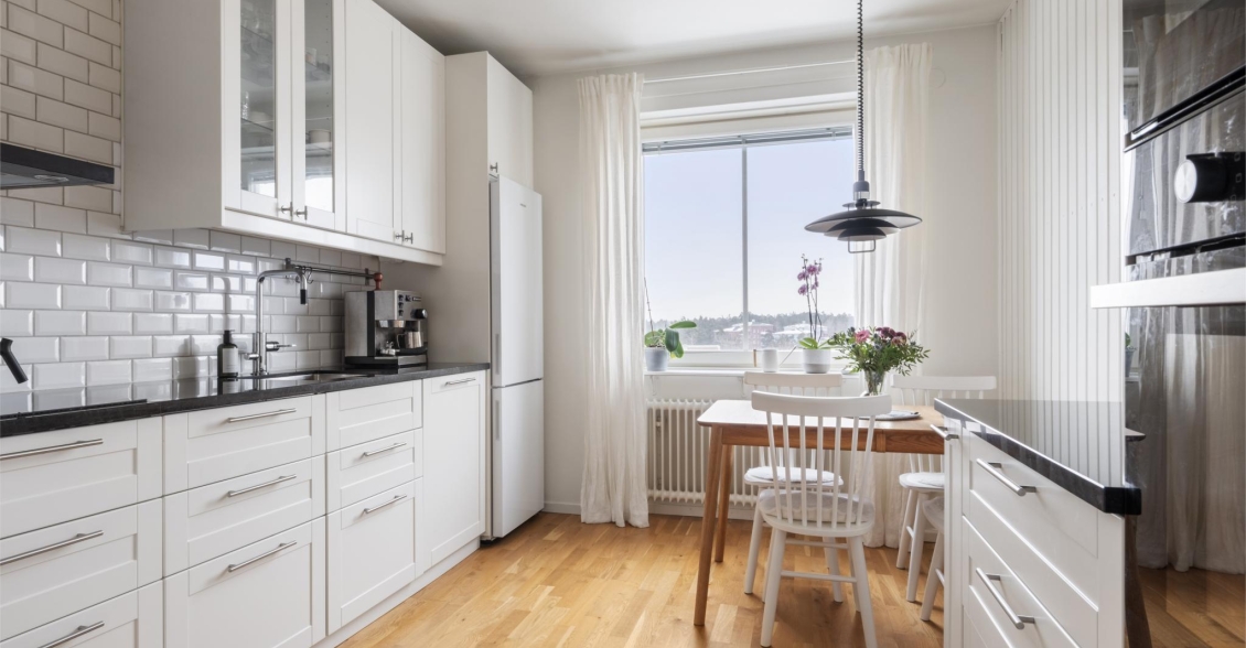 Modernt och stilrent kök med gott om förvaringsutrymme i både skåp och lådor i vitt utförande. Överskåp med glasdörrar ramar in platsen för finporslinet och ger ett luftigt intryck. Väggarna pryds av fasade vita kakelplattor ovan en mörk bänkskiva i sten med nedsänkt ho – en elegant kontrast som skapar karaktär. Köket är fullt utrustat med kyl/frys, inbyggd ugn och micro, induktionshäll med kolfilterfläkt samt diskmaskin. Intill fönstret finns en trivsam matplats med härlig utsikt över omgivningarna.