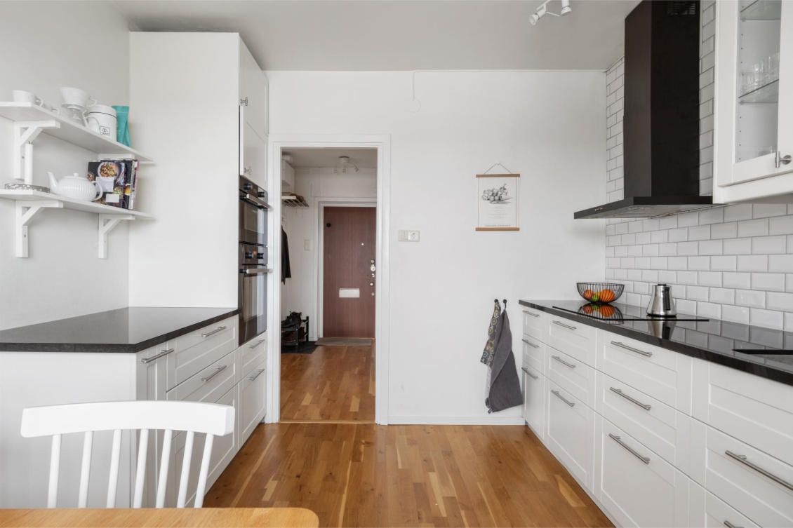 Genom säkerhetsdörren välkomnas du av en rymlig hall med gott om förvaring. Här finns hatthylla och två klädkammare – den ena smidigt placerad direkt innanför dörren för avhängning av ytterkläder och skor, den andra i anslutning till sovrummet med generöst utrymme för kläder och säsongsförvaring. Vackra ekparkettgolv löper vidare in i bostadens övriga rum och skapar en enhetlig och välkomnande känsla.
