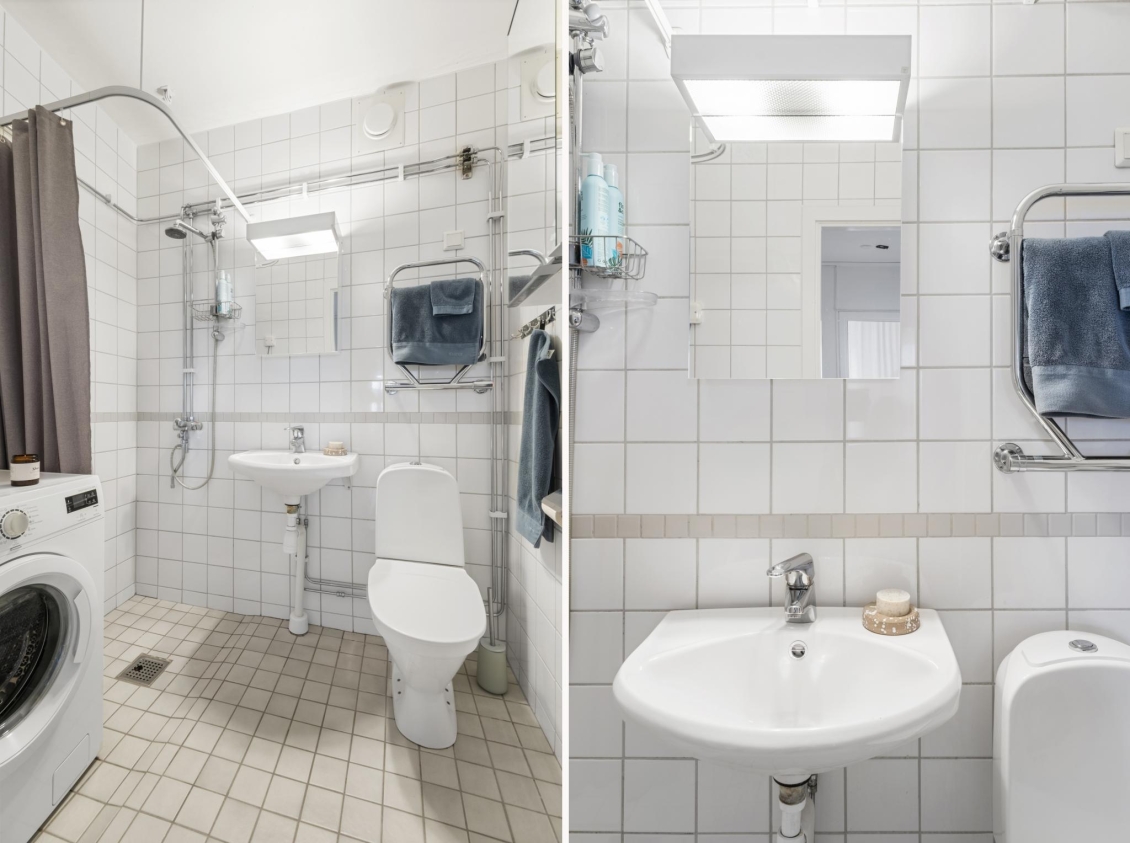 Helkaklat badrum i vitt och ljusgrått från föreningens stambyte 2007. Utrustat med dusch, wc, handfat, spegelskåp, handdukstork och tvättmaskin. För den som önskar extra klädvård finns även föreningens moderna och välskötta tvättstuga bekvämt belägen i samma trapphus.