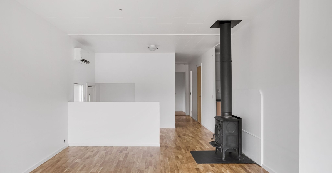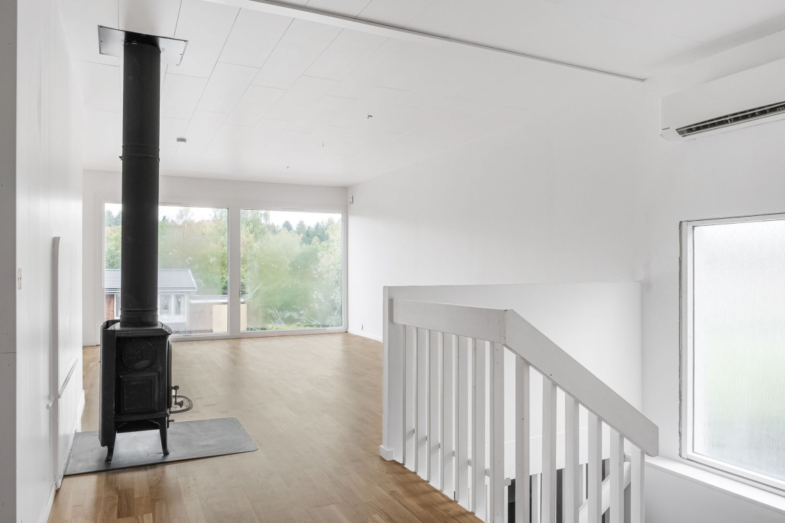 Allrum/gillestuga Detta utrymme kan t.ex. användas som sällskapsrum, bibliotek eller lekrum. Här finns bostadens andra eldstad.