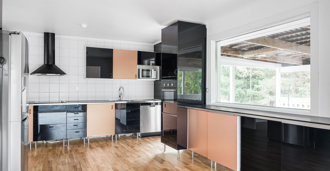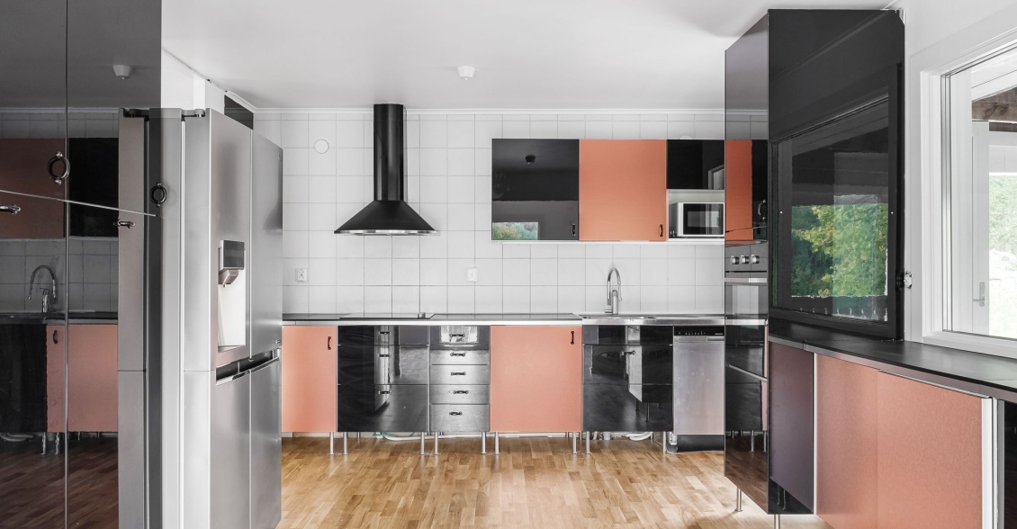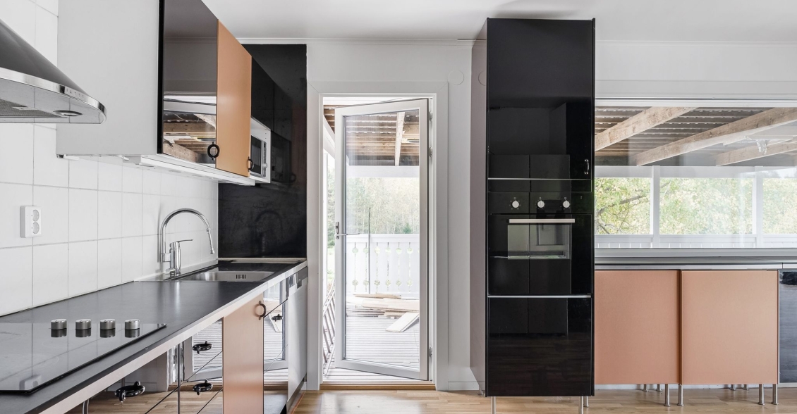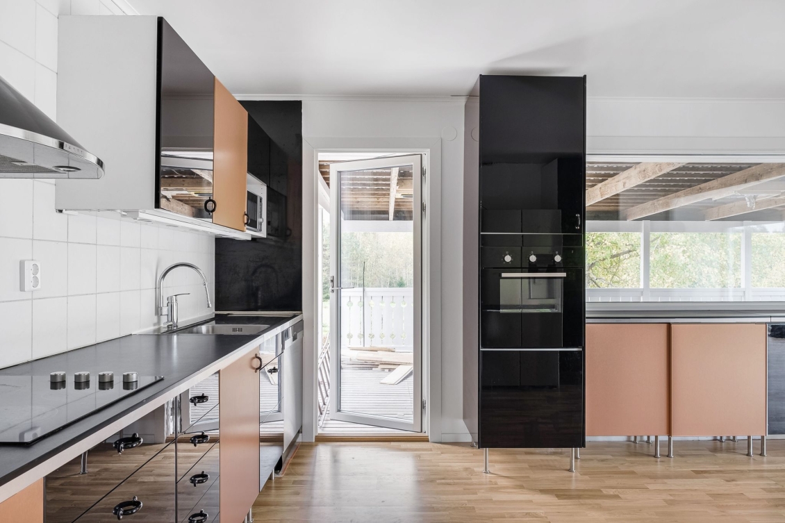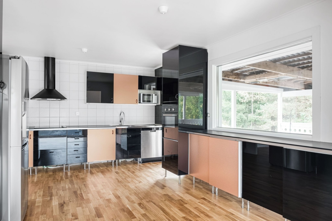 Kök Köket monterades 2008 och går i högglansigt svart ovh rosé. Generösa arbetsytor och förvaring. Kyl och frys saknas.