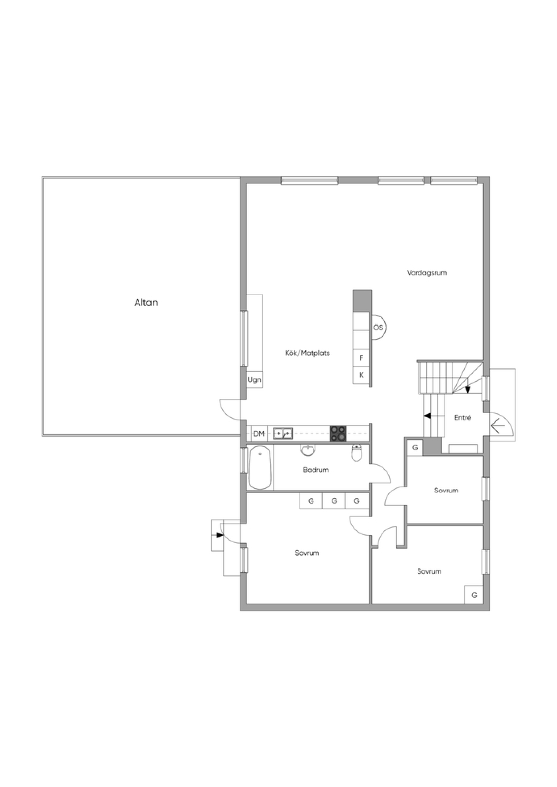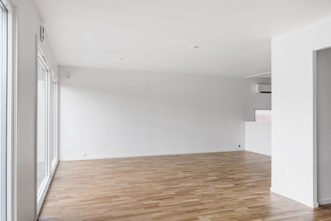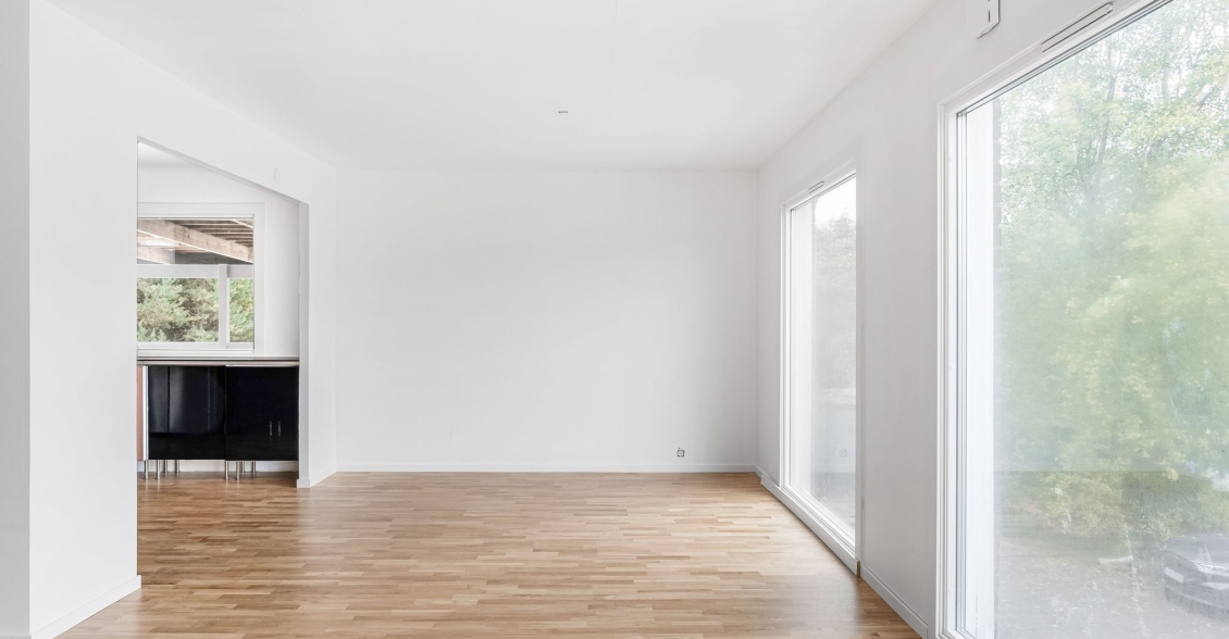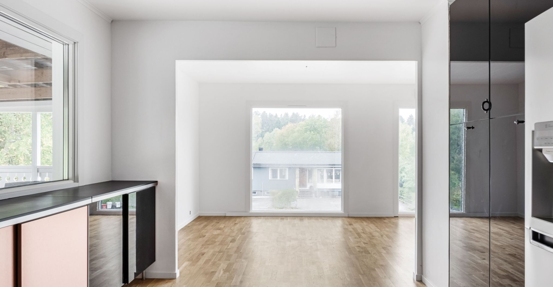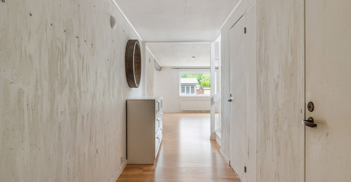 Hall Välkomnande hall som mynnar ut till alla utrymmen på våningsplanet; Vardagsrum och kök i öppen planlösning samt tre sovrum.