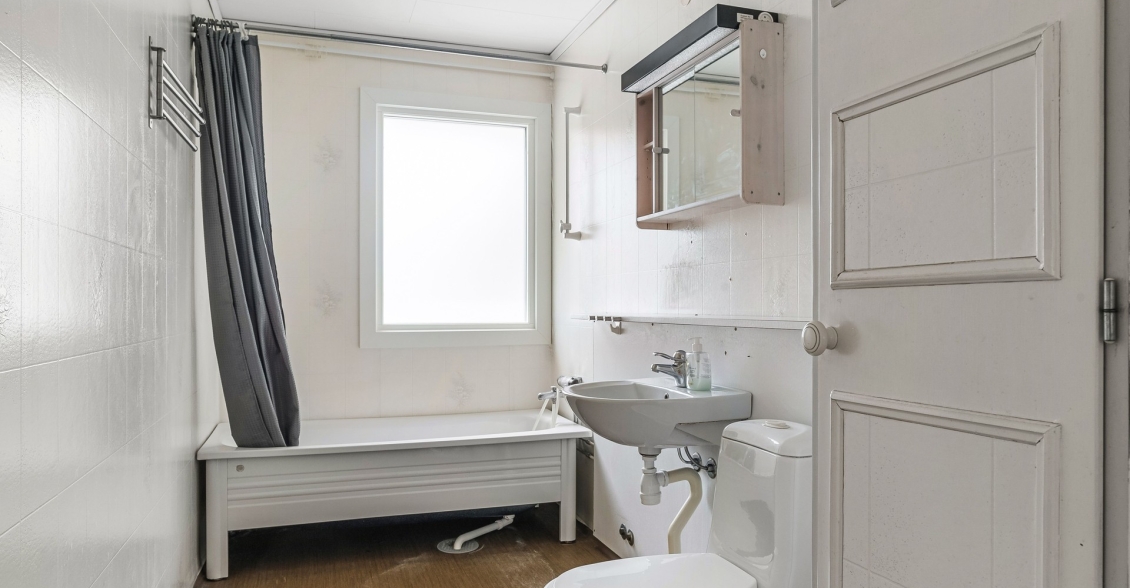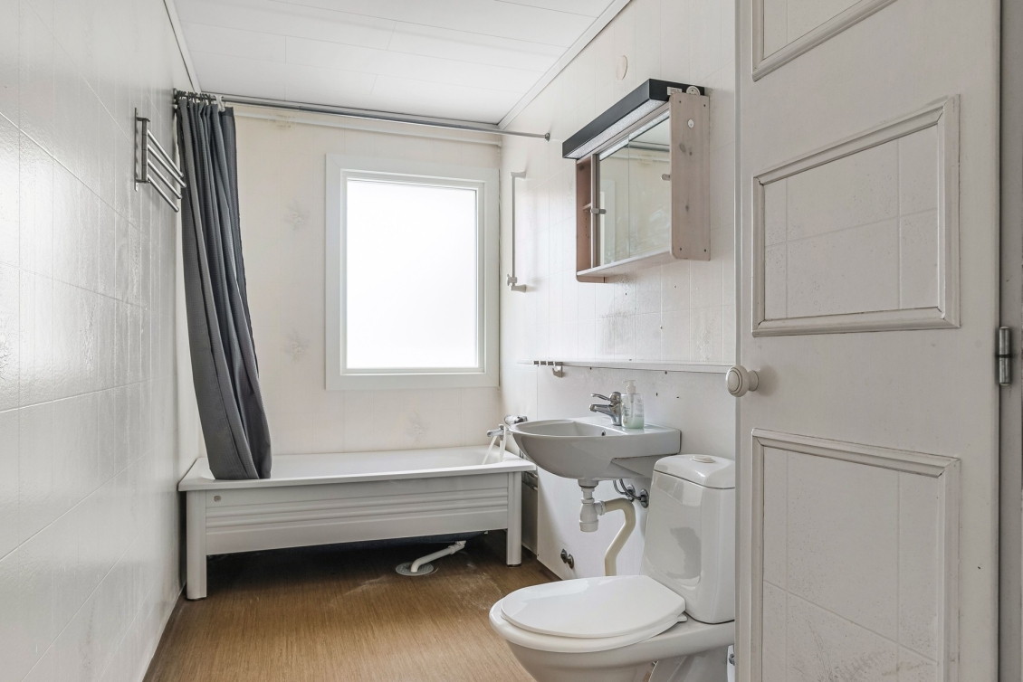 Badrum Badrum med våtrumsmatta, badkar, wc och handfat.