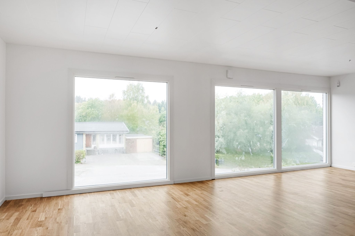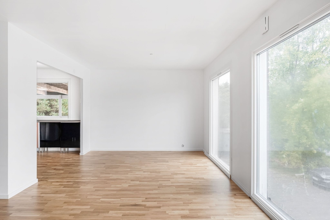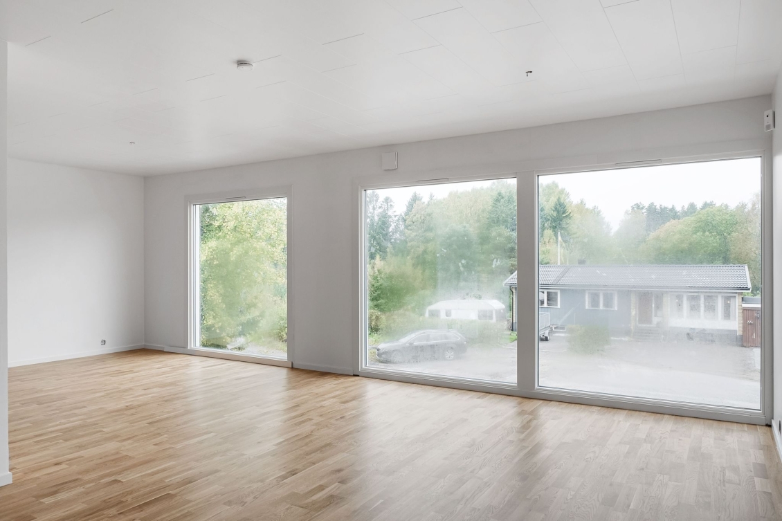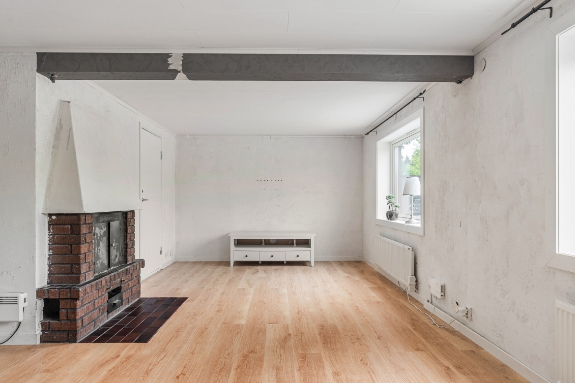 Vardagsrum Ett stort fönsterparti skänker ljus och trivsel och i mitten finns en mysig eldstad. Vardagsrummet är tillräckligt stort för att rymma både middagsbord och soffmöblemang. Trevlig öppan planlösning mot kök.