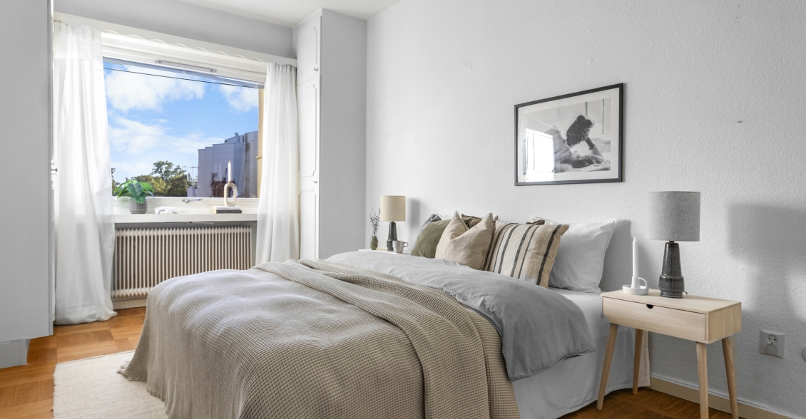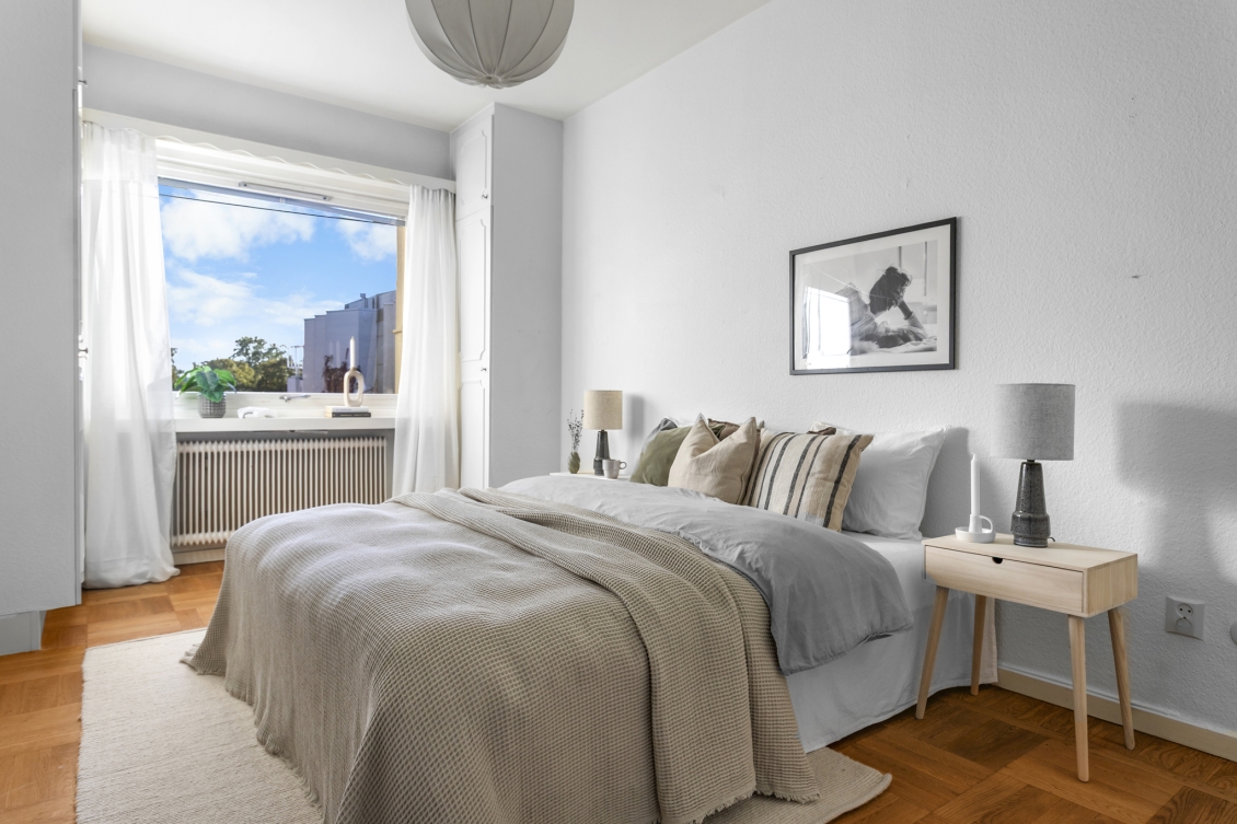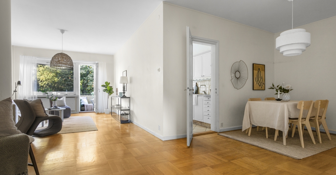 Bostaden mäter hela 80kvm och går därför att bygga om till en trea, eller kanske en tvåa med öppen planlösning mellan kök och vardagsrum och sammanhållen utsikt över Stureparken.