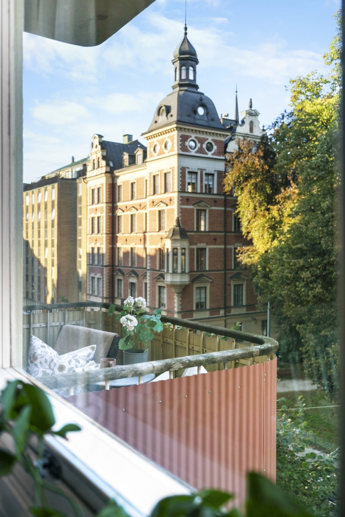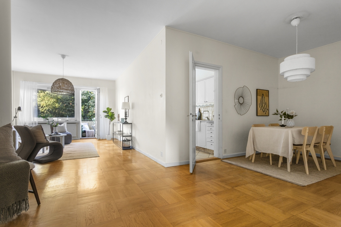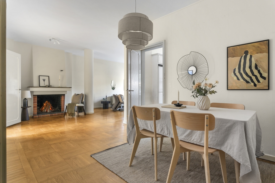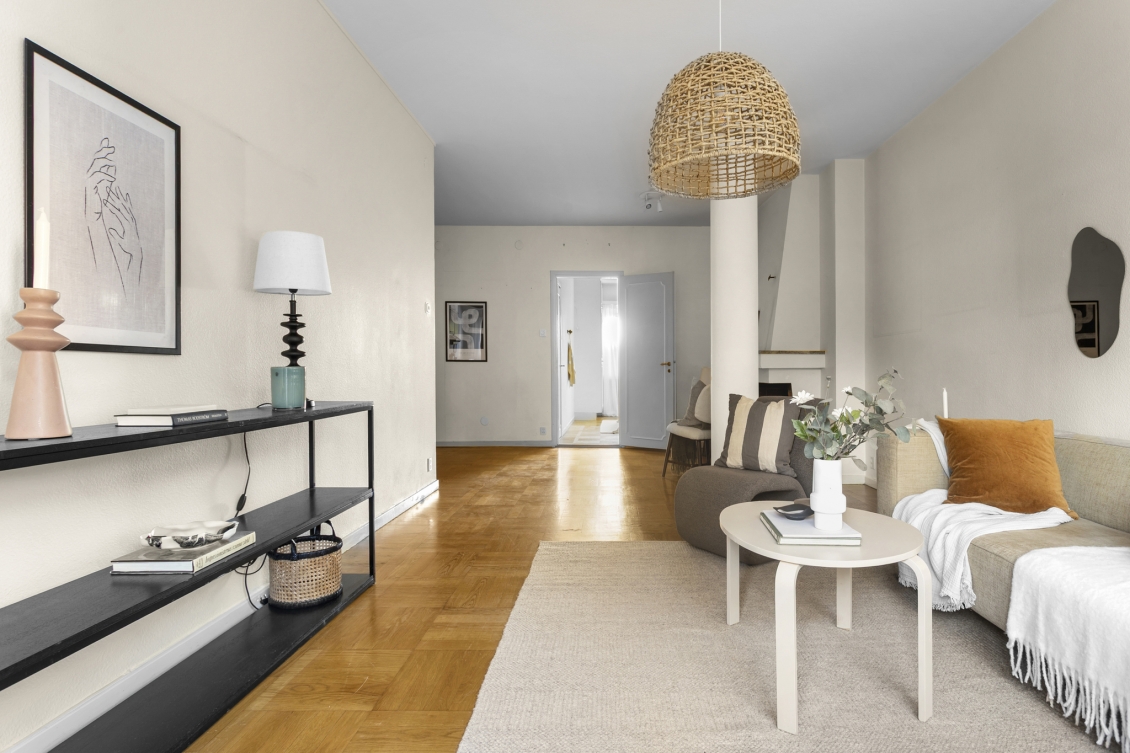 Luftigt vardagsrum med en stor eldstad och fönster mot den lummiga Stureparken. Utgång till balkong som även den vetter mot parkens grönska. Holländsk ekparkett som sträcker sig från den inre delen av hallen in vardagsrum och sovrum.