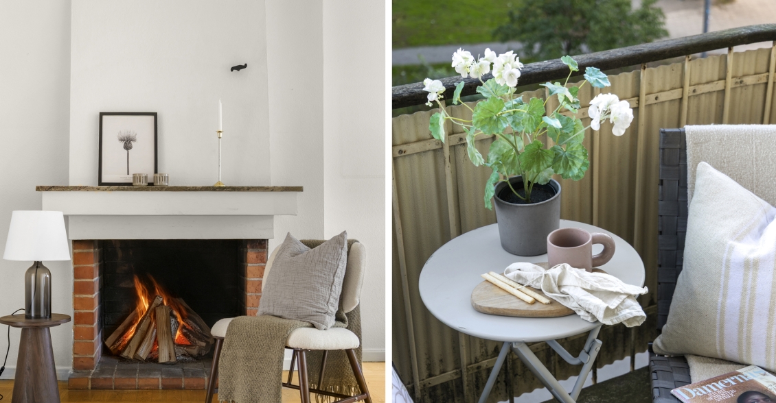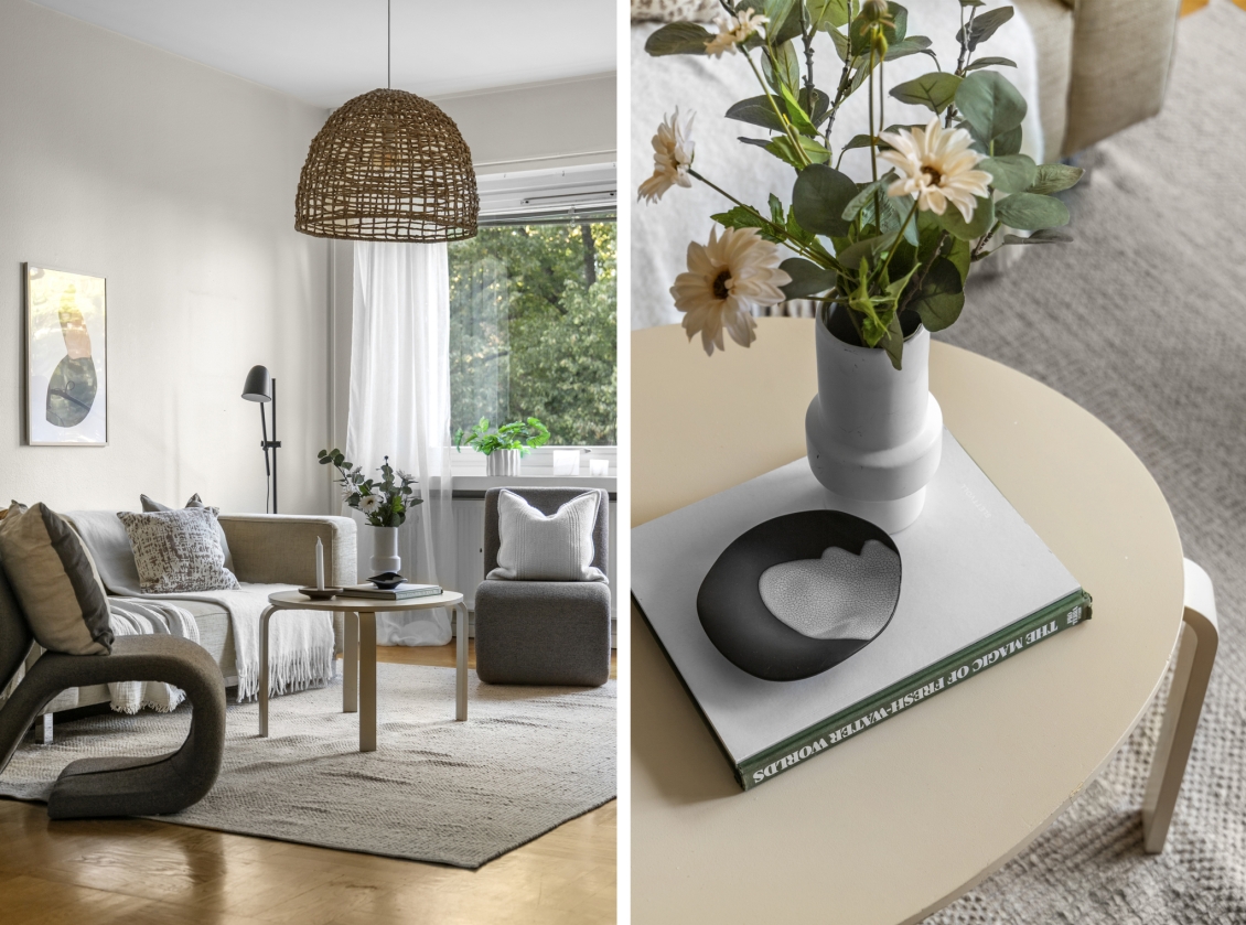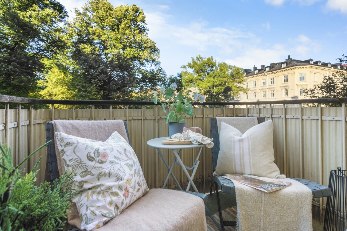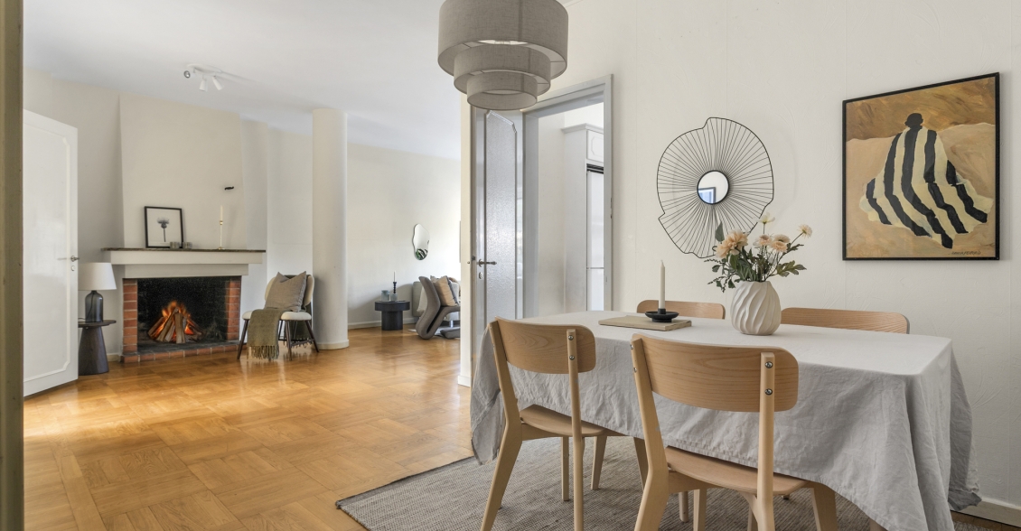 Luftigt vardagsrum med en stor eldstad och fönster mot den lummiga Stureparken. Utgång till balkong som även den vetter mot parkens grönska. Holländsk ekparkett som sträcker sig från den inre delen av hallen in vardagsrum och sovrum.
