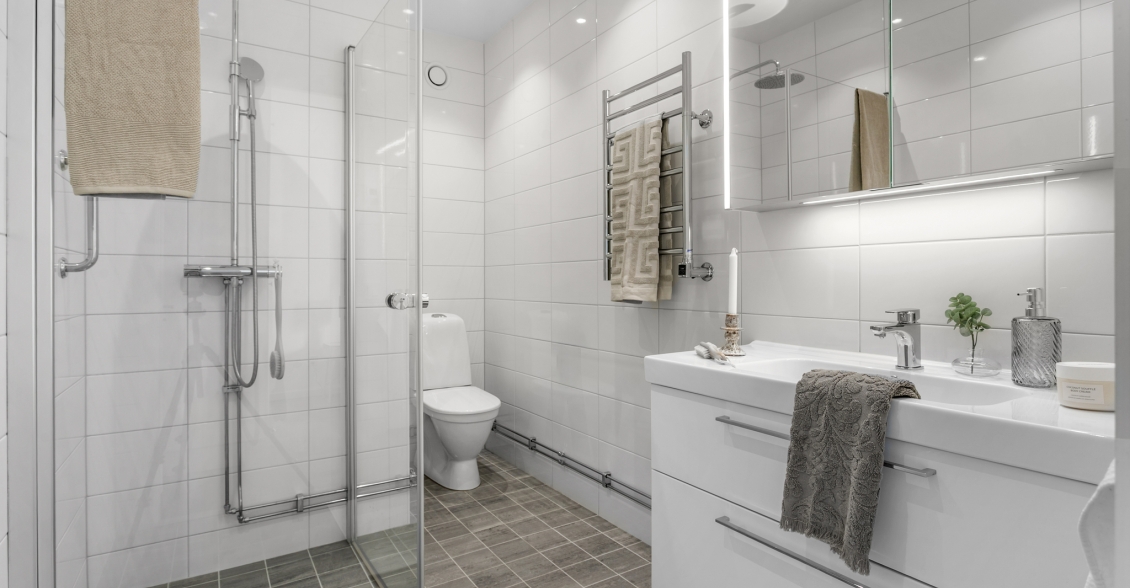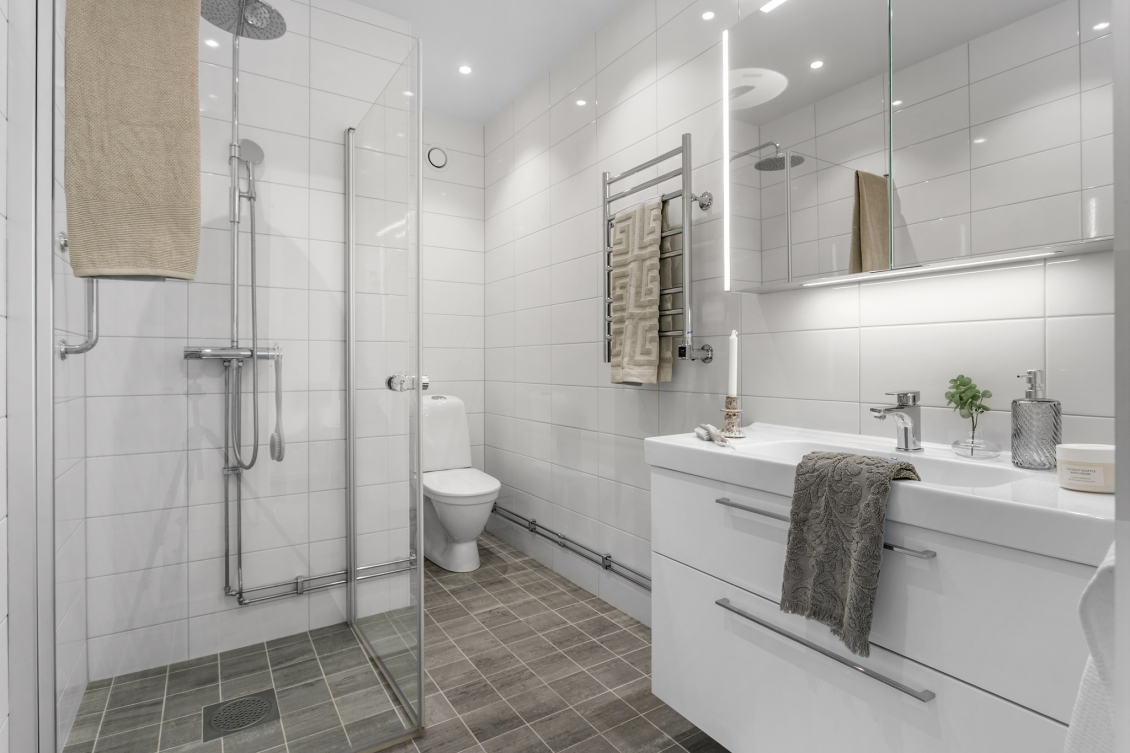 Fräscht helkaklat badrum med dusch, wc och handfat med kommod från 2020.