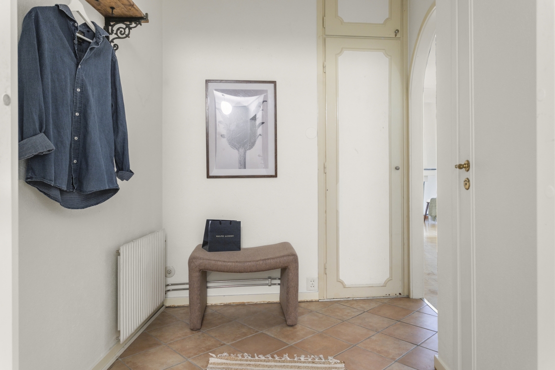 Rymlig hall med en inre del som idag används som middagsplats där man kan njuta av eldstaden i vardagsrummet, Denna yta lämpar sig även för hemmakontor eller bibliotek.