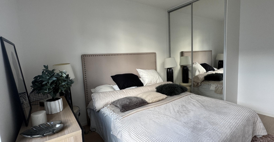 Ett rofyllt sovrum med garderober.