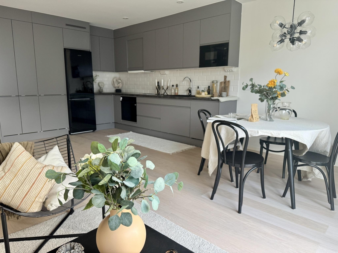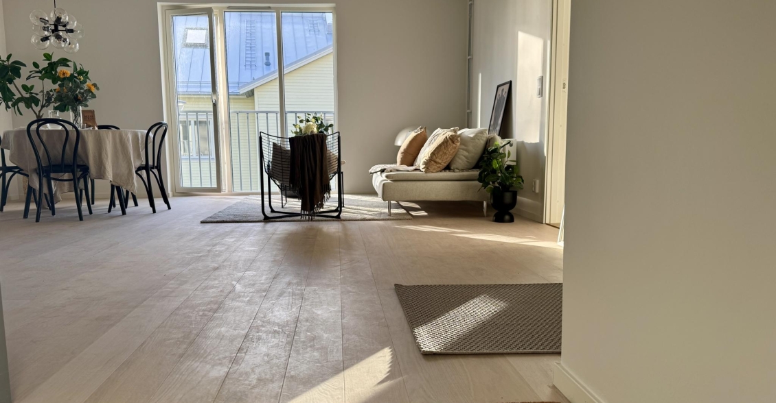 Vardagsrum och kök i ljus öppen planlösning mot kök.
