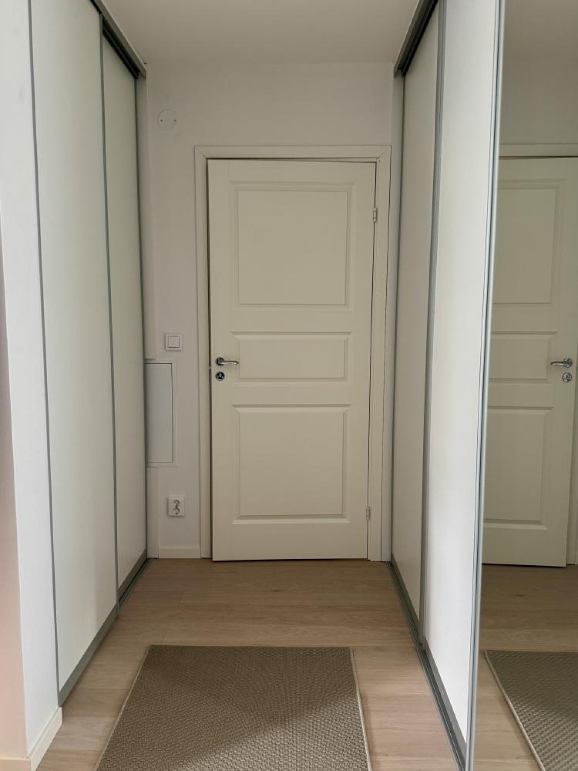 Inbjudande hall med snygg och praktisk skjutdörrsgarderob med spegeldörrar.