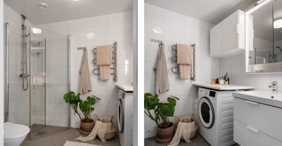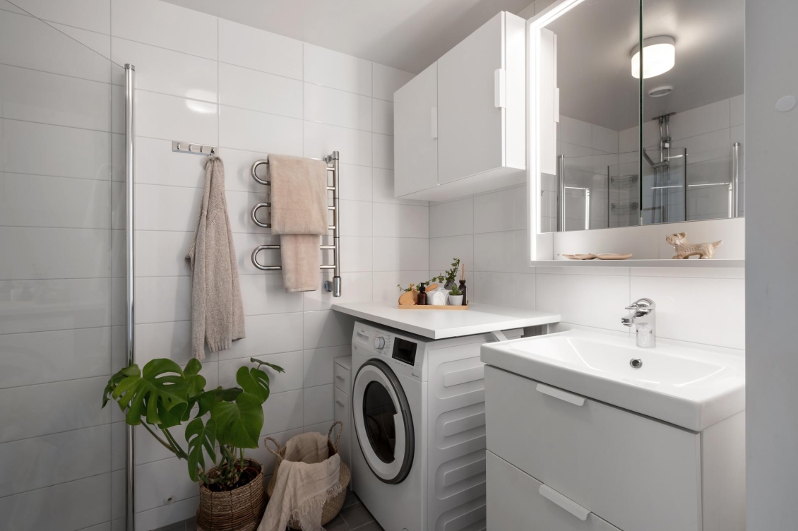 Det helkaklade fräscha badrummet är utrustat med allt som behövs inklusive en tvättmaskin (kombi för tvätt/tork) för extra bekvämlighet i vardagen.