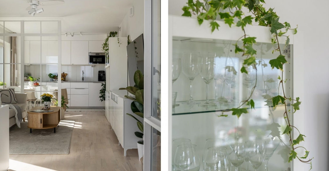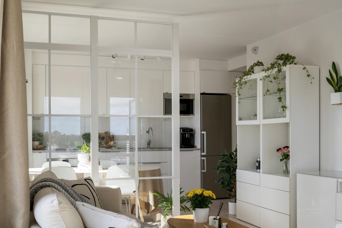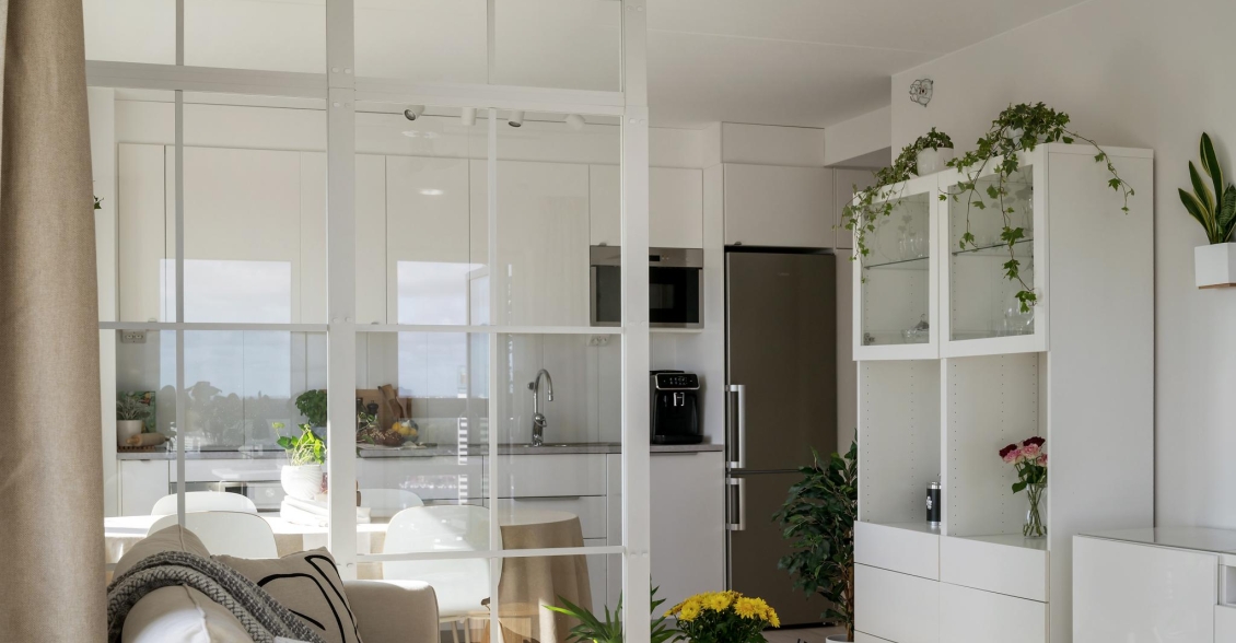 Kök och vardagsrum delas av med en smakfull och praktisk"industrivägg" i glas vilket skapar en känsla av tydlig rumsindelning samtidigt som ljus och rymd behålls. I vardagsrummet finns gott om plats för en soffgrupp och annat önskat möblemang. I dagsläget disponeras en hörna som hemmakontor.