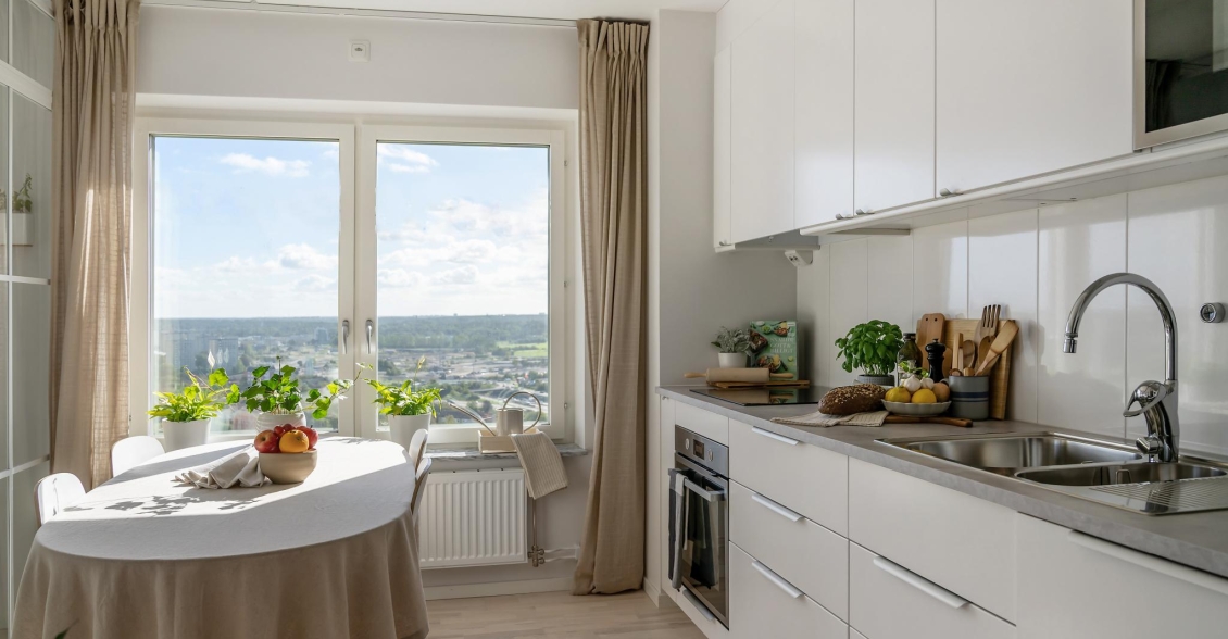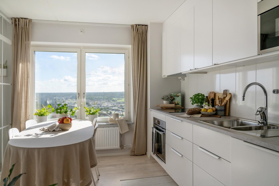 Köket är välutrustat med högkvalitativa vitvaror, fina arbetsytor och goda förvaringsmöjligheter bakom vita släta luckor. I ljuset från kökets fönsterparti finns plats för ett köksbord. Perfekt för trevliga måltider framför den fina vyn.
