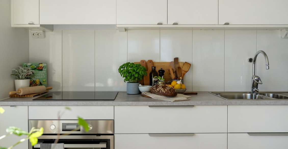 Vardagsrum/Kök Stilrent kök med vit industrivägg som avdelar mot vardagsrum. Goda förvaringsmöjligheter i över- och underskåp med vita släta luckor. Fin arbetsyta på en köksbänk med ljus bänkskiva. Stänkskydd av vitt kakel. Köket är utrustat med kyl/frys, induktionsspis, ugn, fläkt och mikrovågsugn.