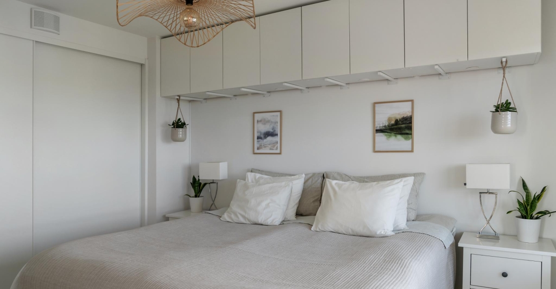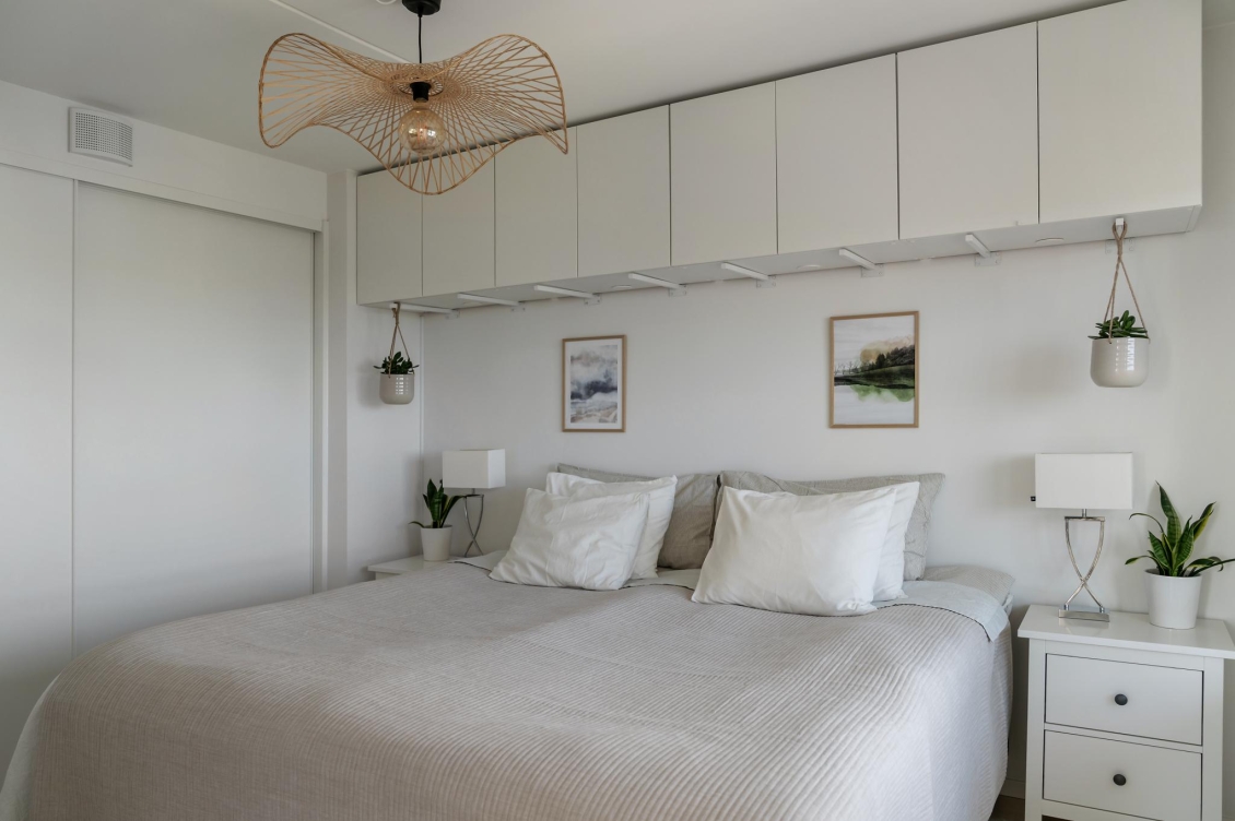 Sovrum Mycket trivsamt sovrum. Ett generöst fönsterparti mot balkongen släpper in naturligt ljus och erbjuder en vacker utsikt att vakna till. Plats finns för en stor säng. Inbyggd garderob med skjutdörrar ger mycket goda förvaringsmöjligheter. Ovan sängen finns väggskåp som ger extra förvaringsmöjligheter.