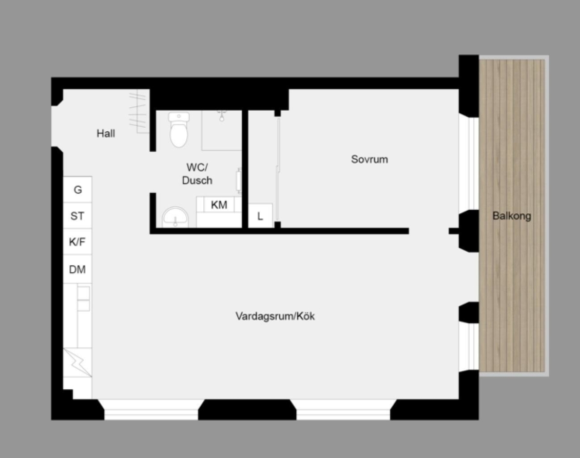 Utrymme finns för en matgrupp invid köket samt soffgrupp, TV-möbel och annat önskat möblemang i den avskilda delen för vardagsrum. Härifrån nås balkongen. Hela rummet har rikligt med naturligt ljusinsläpp från generösa fönsterpartier. Ljust parkettgolv, väggar målade i en vit kulör och spotlights i tak.