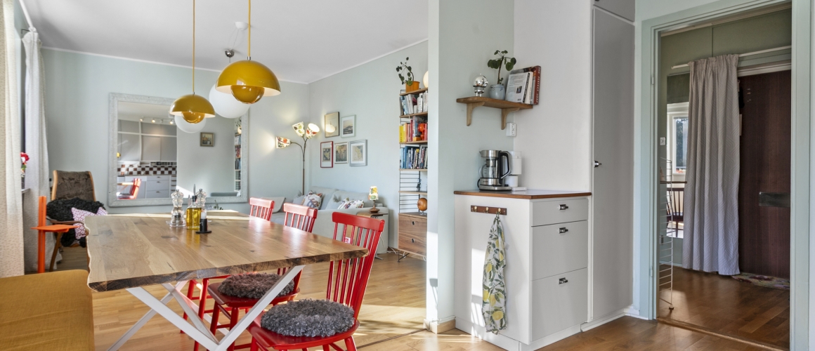 Perfekt planerad 2:a med öppen planlösning mellan kök och vardagsrum. Sovrum med plats för dubbelsäng och modernt badrum. Trivsamt lugnt läge endast 2 minuters promenad från tunnelbanan.