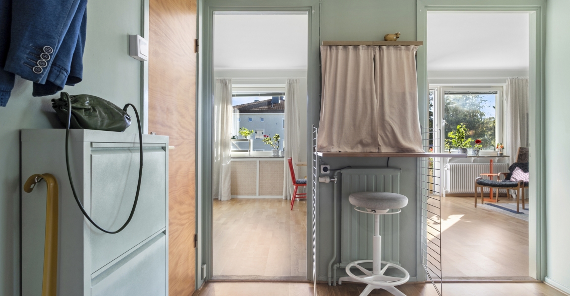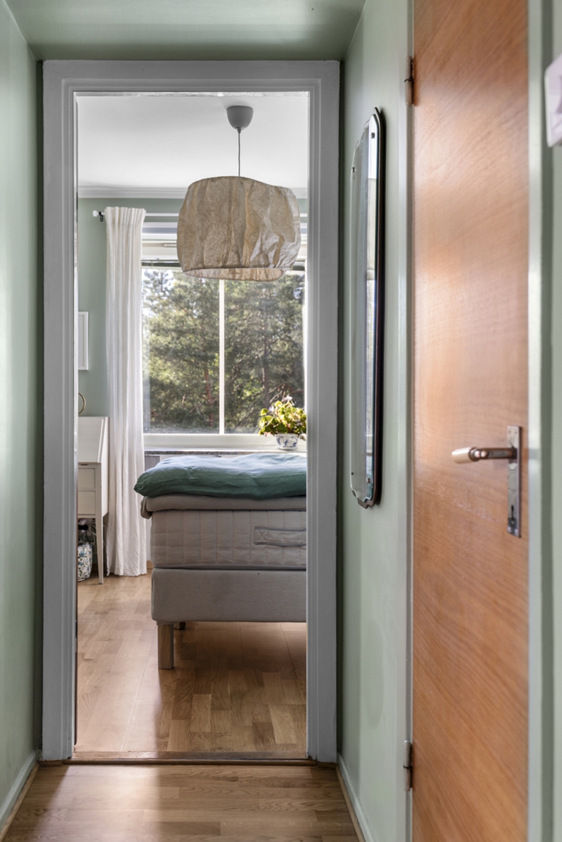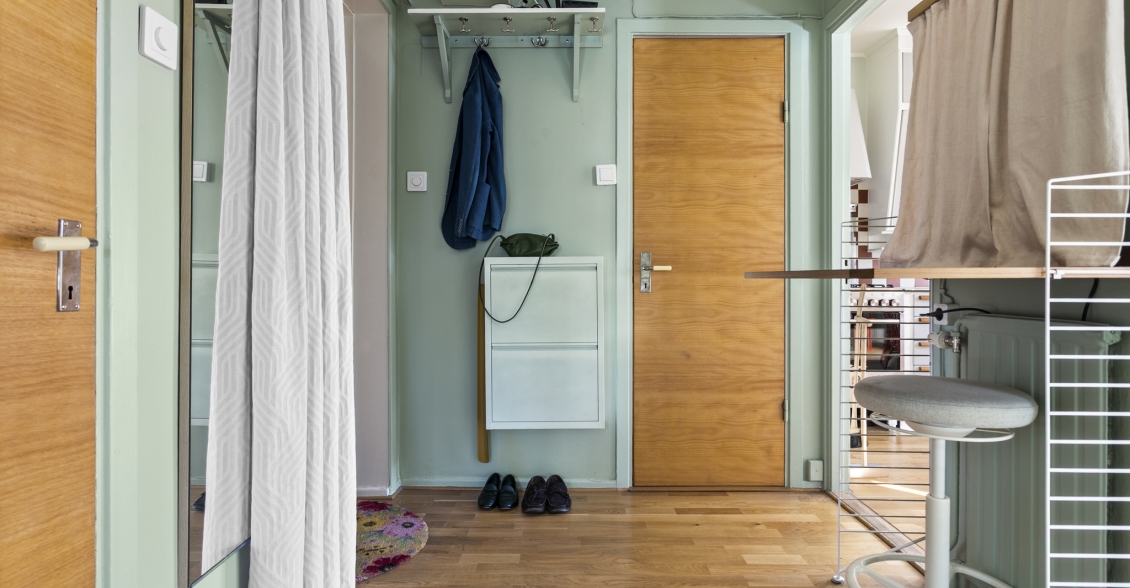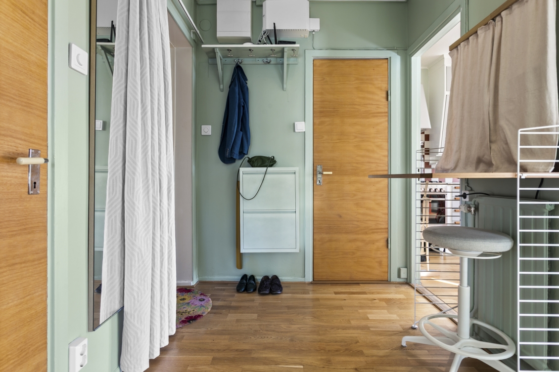 Välkomnande hall med gott om utrymme för avhängning samt förvaring i den rymliga klädkammaren. Hallen går i vinkel mot sovrummet och det finns ytligare förvaring i form av två platsbyggda överskåp vid ingången till sovrummet. Parkettgolv genomgående.