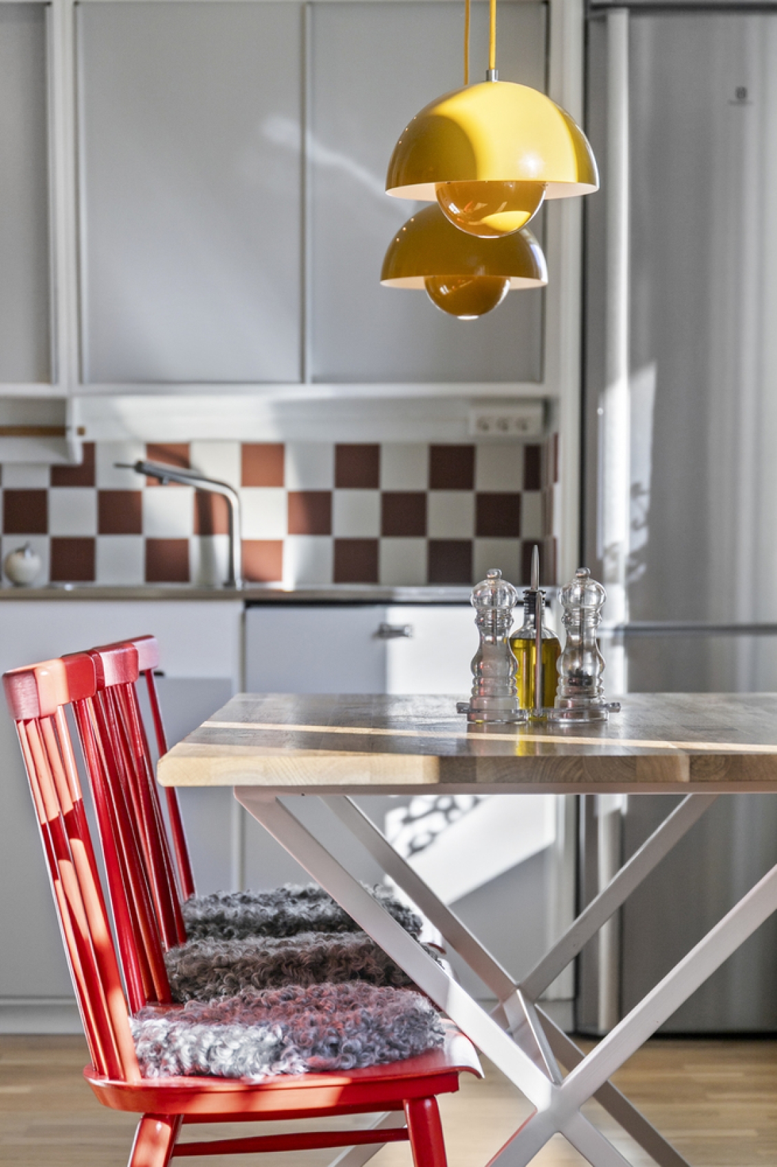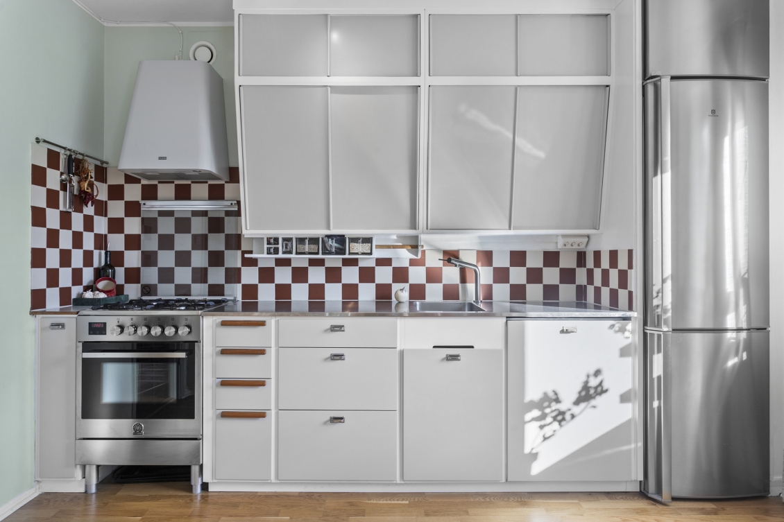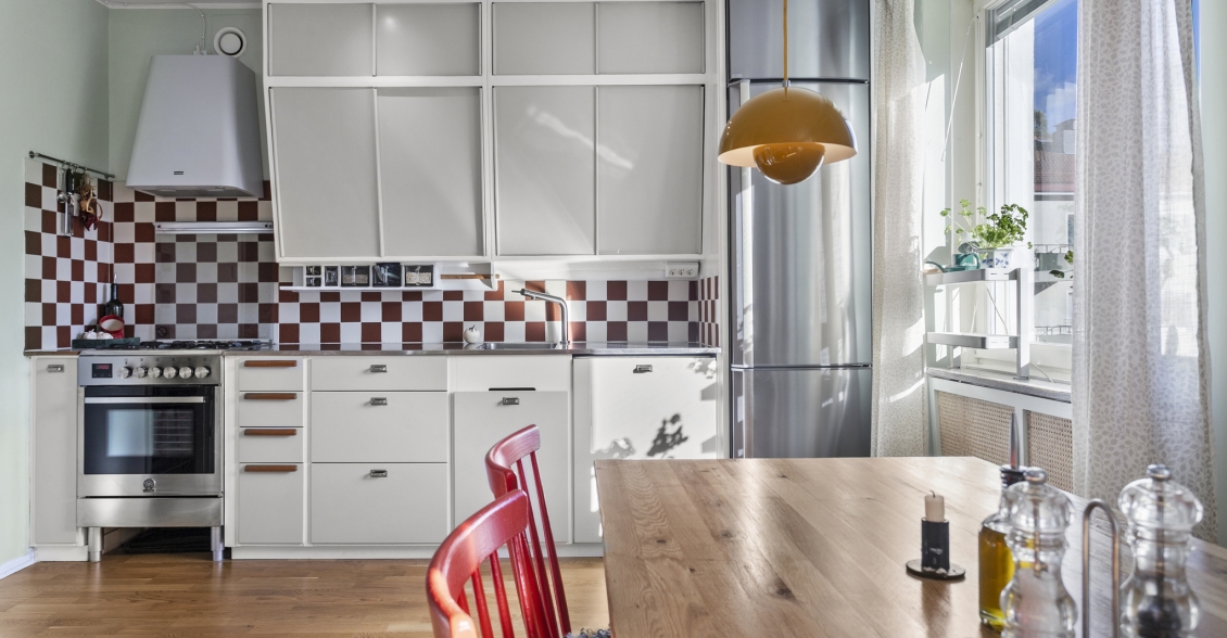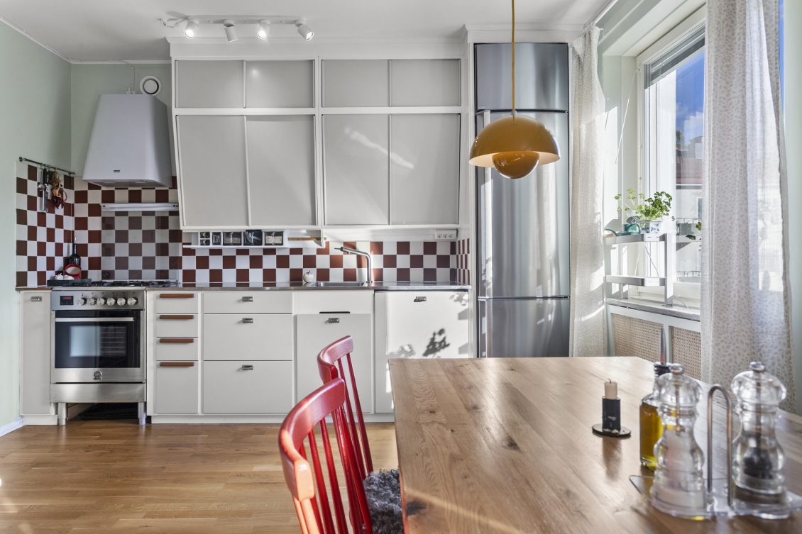 Klassiskt 50-tals kök som fått sig ett ansiktslyft men med alla gamla tidstypiska detaljer bevarade. Intill fönstret finns utrymme för en trevlig matplats. Köket är utrustat med nyare kyl/frys, ugn och köksfläkt.