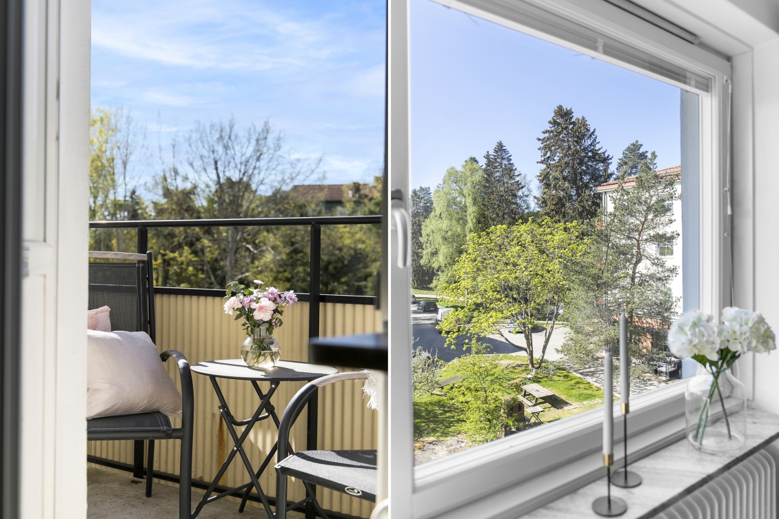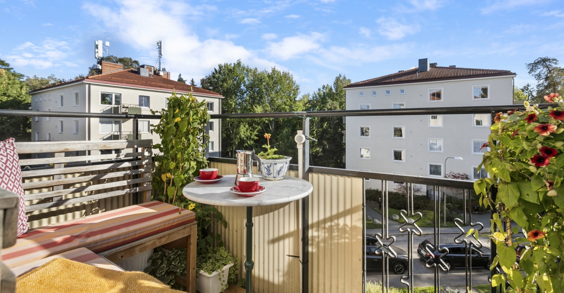 Mycket trevlig balkong i väst med eftermiddags-/kvällssol. Fina vyer över naturmark. Plats för blommor, café bord och stolar.