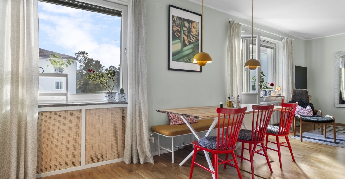 Stort vardagsrum i gavelläge med fönster i två väderstreck och fantastiska vyer över området runt föreningen och ett lummigt skogsområde. Detta rum har ett fantastiskt ljusinsläpp och på balkongen kan du njuta av sol från lunch till sen kväll. Vardagsrummet erbjuder gott om plats för soffgrupp och förvaringsmöbler.