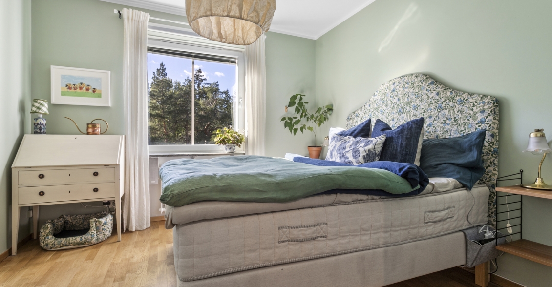 Ljust och trevligt sovrum med fönster i väst. Gott om plats för dubbelsäng och sängbord. Förvaring finns i form av inbyggd garderob.