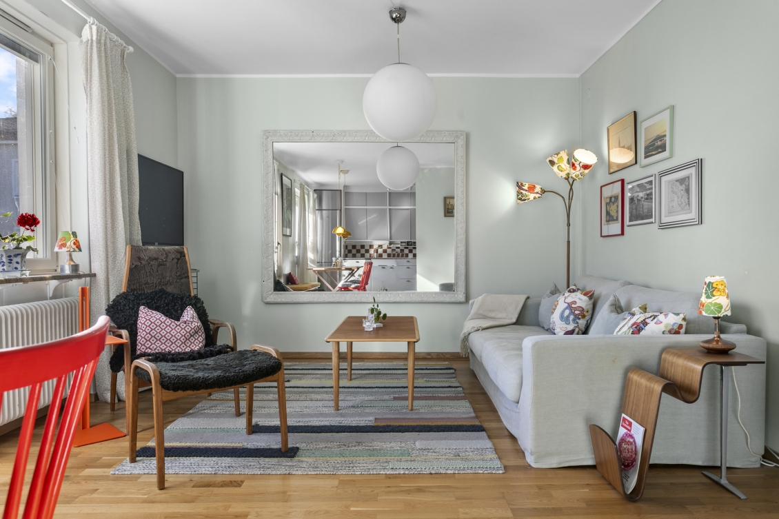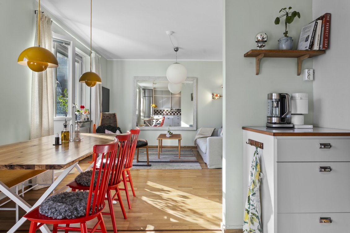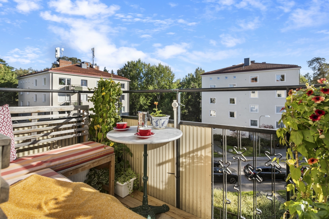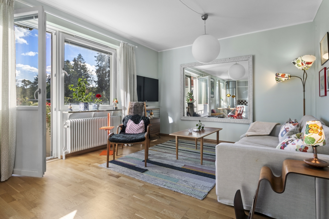 Välkommen till denna ljusa och trivsamma 2:a i gavelläge, högt upp i huset med soldränkt balkong och härliga vyer. Skuldfri förening med mycket låg avgift. Bostaden ligger på en lugn återvändsgata i trevliga kvarter och erbjuder möjligheten att skapa ett fantastiskt hem där du själv kan välja vilka tidstypiska detaljer du vill bevara. Bostaden disponeras med ett charmigt kök från 50-talet med överskåp i vinkel och nyare vitvaror, stambytt badrum från 2007 i vitt och grått med dusch och tvättmaskin, stort sovrum med en inbyggd garderob samt en stor hall med klädkammare. Till bostaden hör ett förråd.