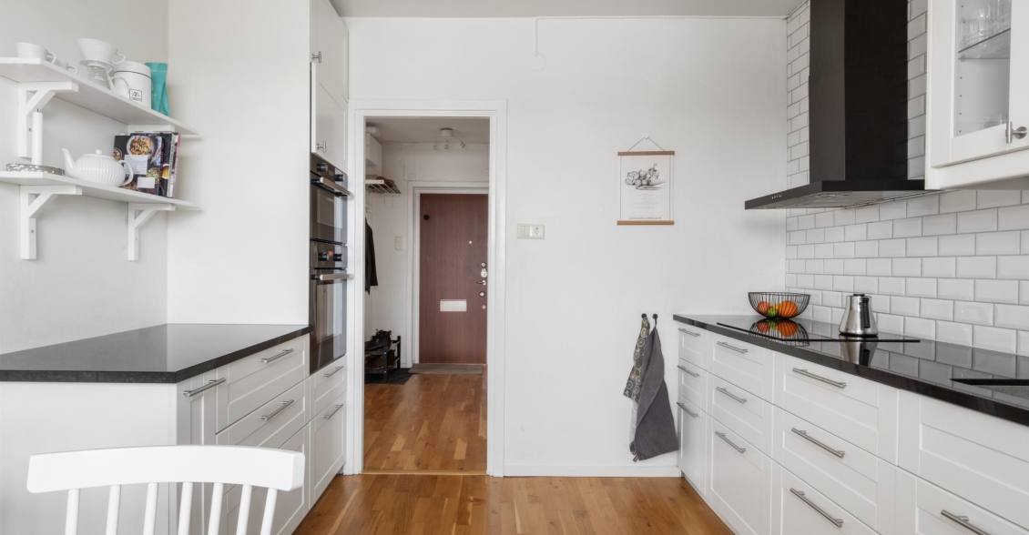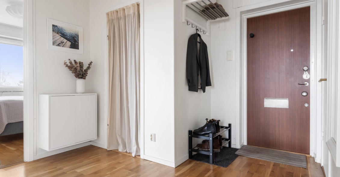 Genom säkerhetsdörren välkomnas du av en rymlig hall med gott om förvaring. Här finns hatthylla och två klädkammare – den ena smidigt placerad direkt innanför dörren för avhängning av ytterkläder och skor, den andra i anslutning till sovrummet med generöst utrymme för kläder och säsongsförvaring. Vackra ekparkettgolv löper vidare in i bostadens övriga rum och skapar en enhetlig och välkomnande känsla.