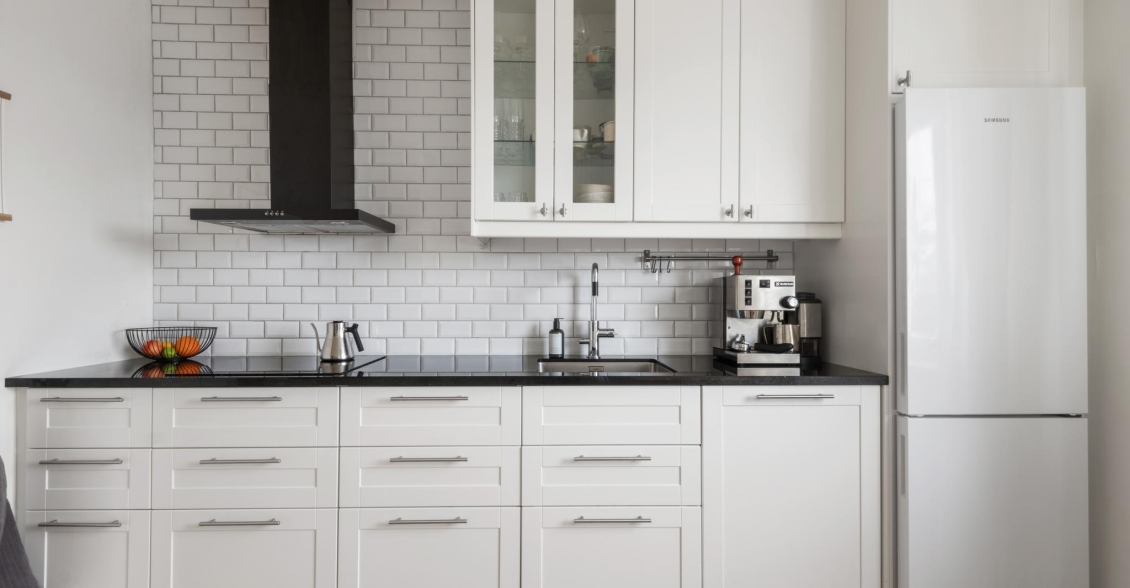Modernt och stilrent kök med gott om förvaringsutrymme i både skåp och lådor i vitt utförande. Överskåp med glasdörrar ramar in platsen för finporslinet och ger ett luftigt intryck. Väggarna pryds av fasade vita kakelplattor ovan en mörk bänkskiva i sten med nedsänkt ho – en elegant kontrast som skapar karaktär. Köket är fullt utrustat med kyl/frys, inbyggd ugn och micro, induktionshäll med kolfilterfläkt samt diskmaskin. Intill fönstret finns en trivsam matplats med härlig utsikt över omgivningarna.