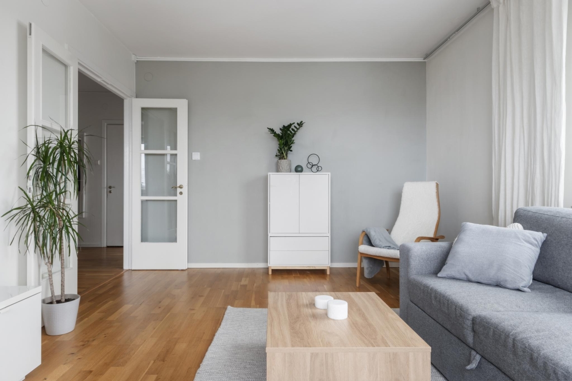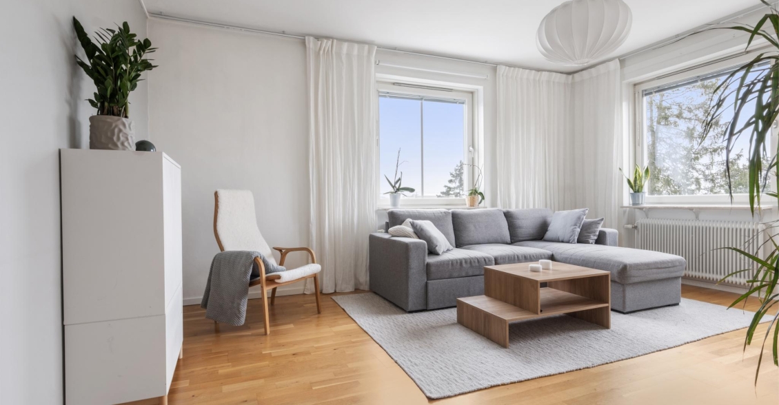 Ett ljust och inbjudande rum i förmånligt gavelläge med generöst ljusinsläpp från två väderstreck. Härifrån har du en vacker utsikt över naturmarken och Globen i fjärran. Rummet erbjuder gott om plats för både soffgrupp, mediemöbel och matplats för större sällskap. Från vardagsrummet nås den soliga balkongen – en rofylld plats att njuta av utsikten över trädtopparna och villaområdet nedanför.