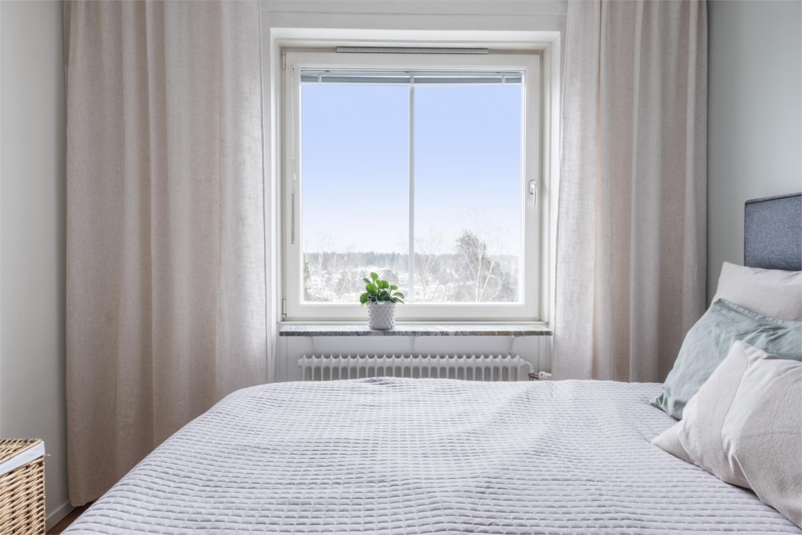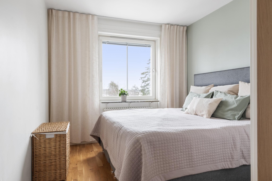 Ett lugnt och avskilt sovrum med plats för dubbelsäng, sängbord och förvaringslösningar. Fönstret i västerläge ger ett mjukt eftermiddagsljus och fin utsikt. I anslutning till sovrummet finns en rymlig klädkammare med gott om plats för kläder och tillbehör.