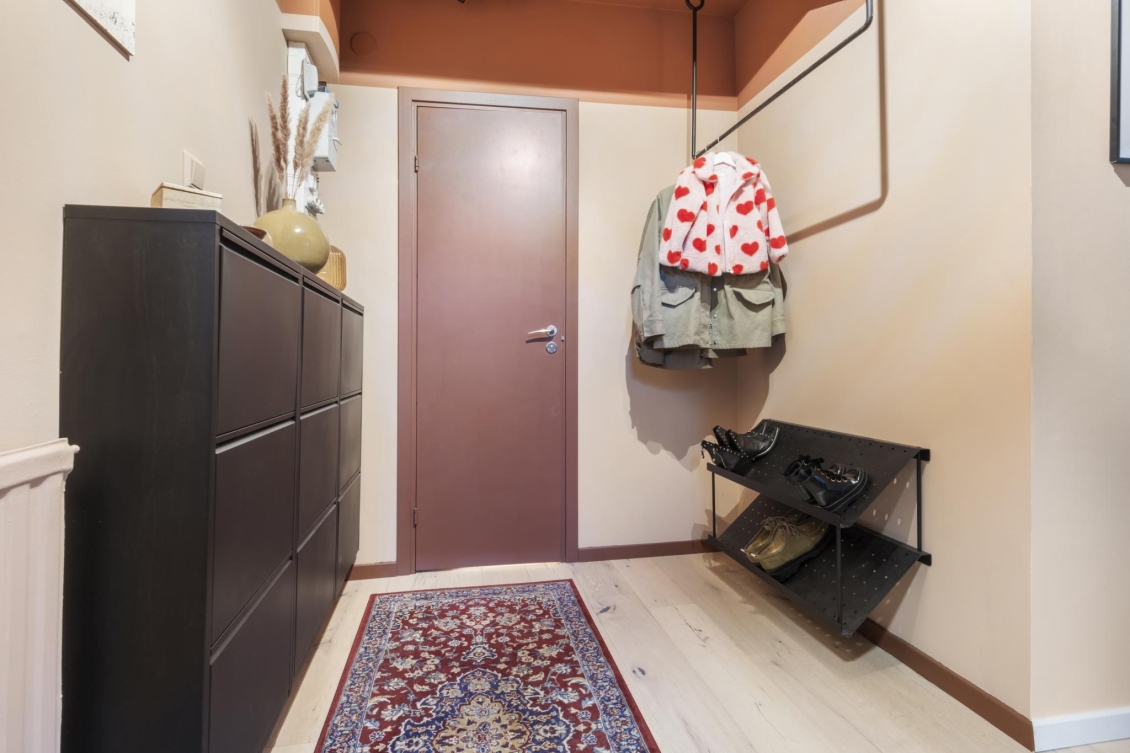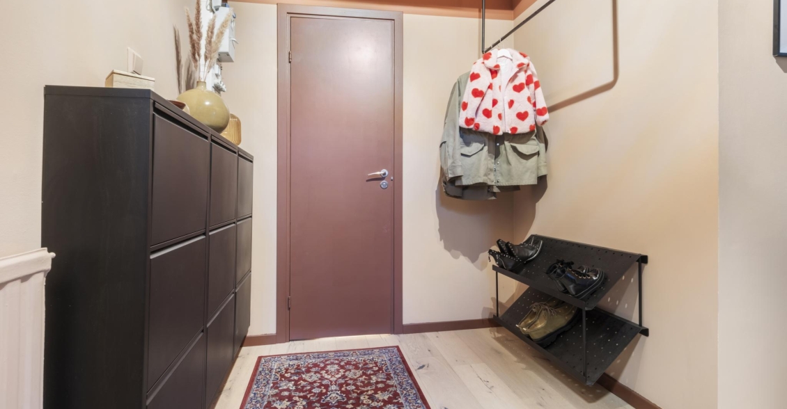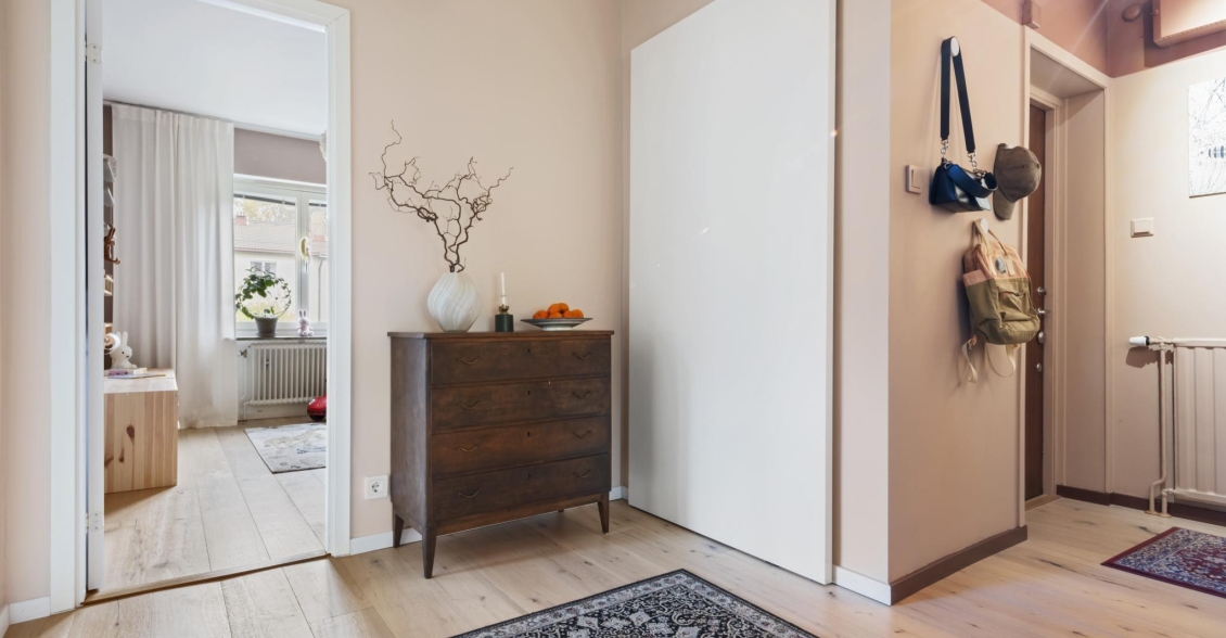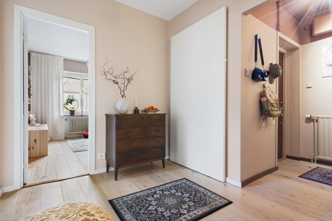 Den rymliga hallen välkomnar dig med gott om plats för avhängning samt en praktisk inbyggd garderob som erbjuder utmärkt förvaring. Här får du en smakfull introduktion till hemmets stilrena helhet och en naturlig koppling vidare till bostadens övriga rum.