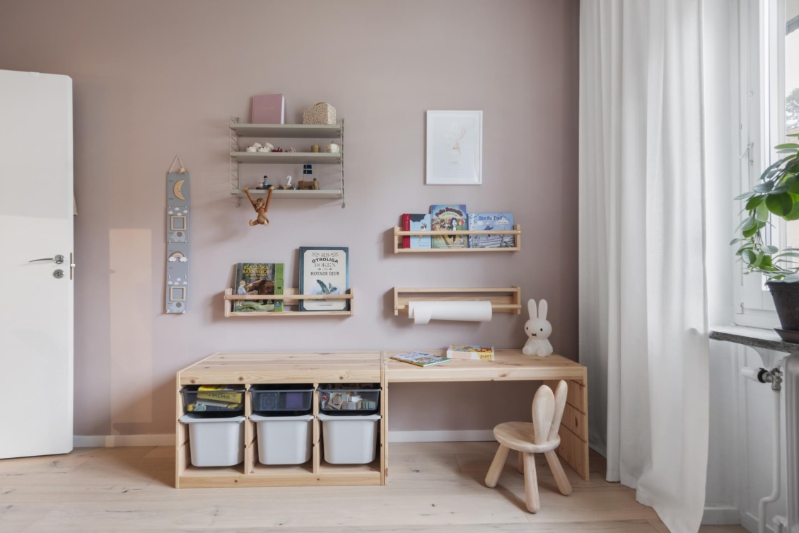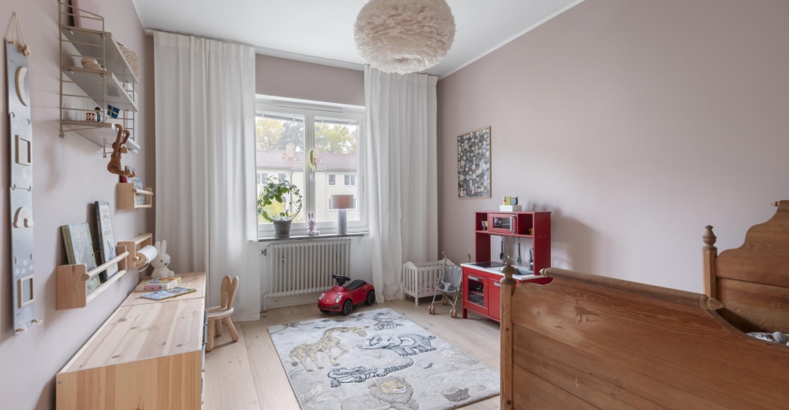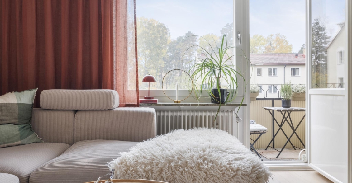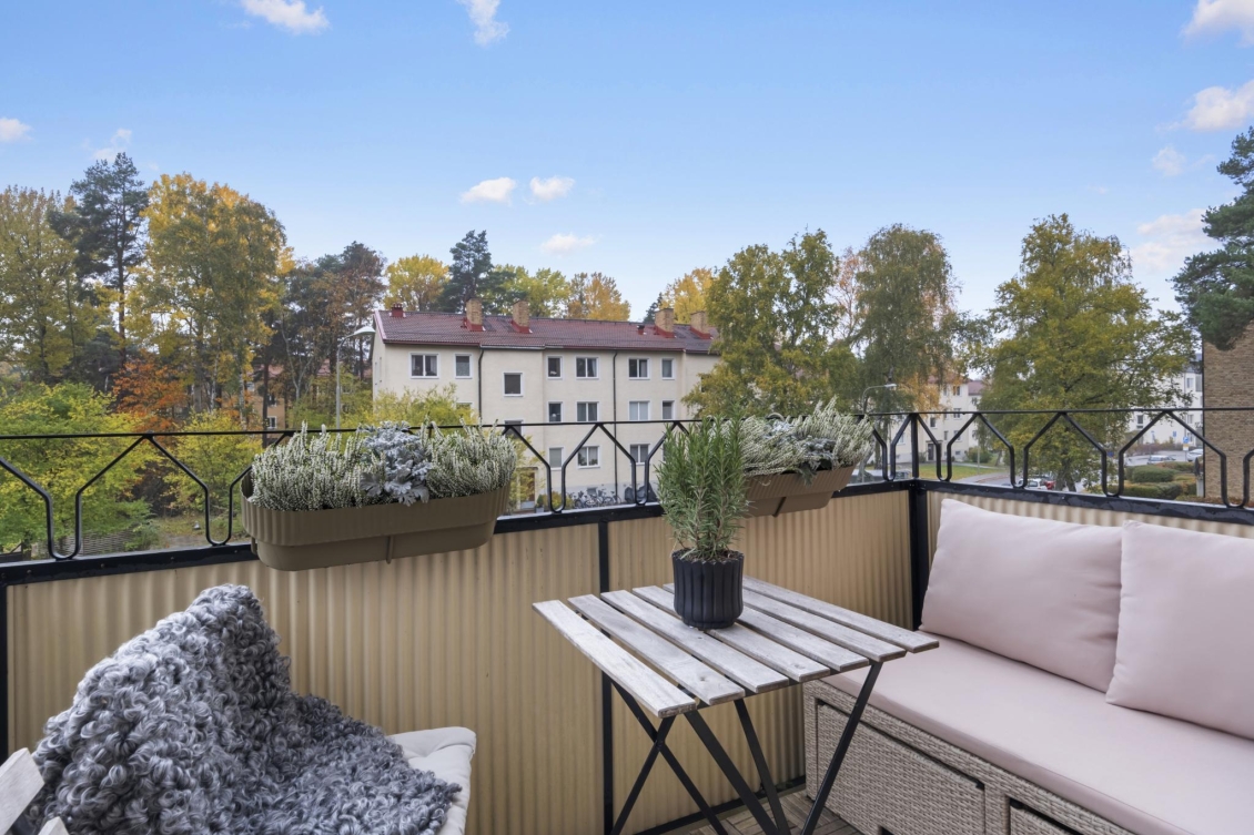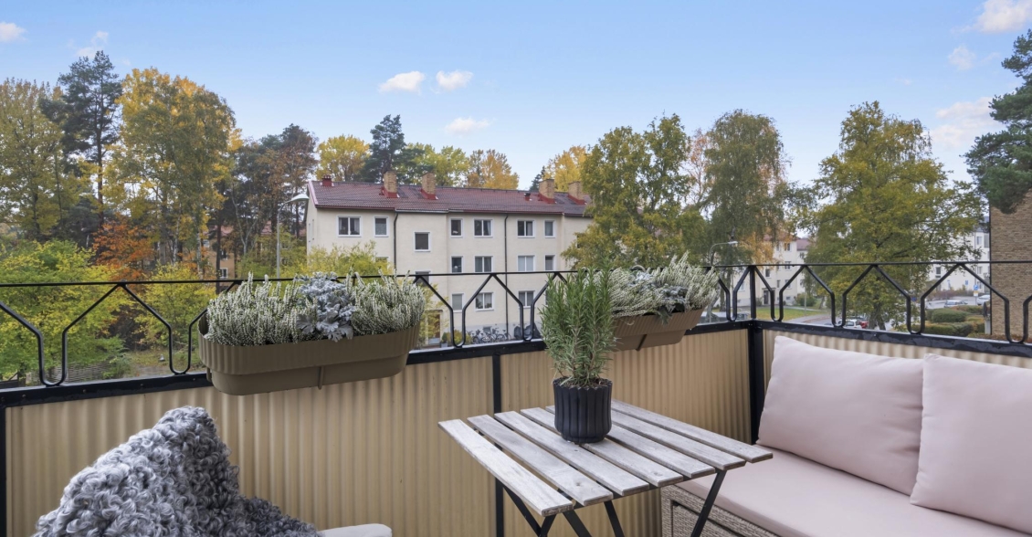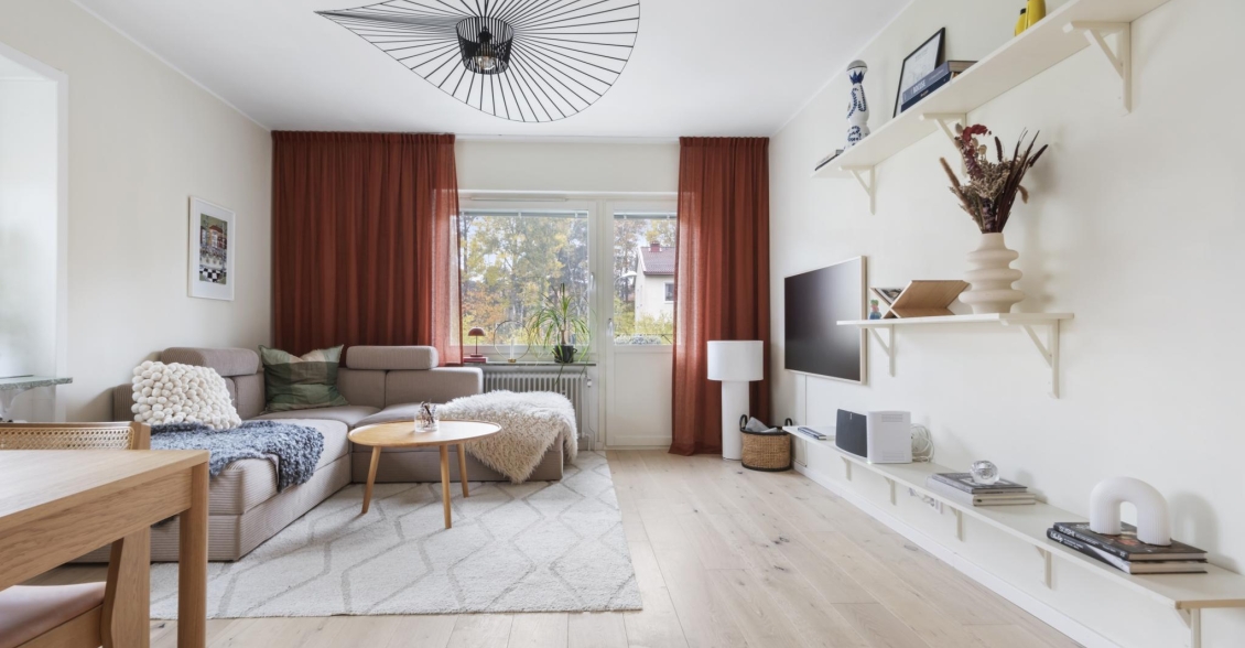 Ett rymligt vardagsrum i ljust gavelläge med gott om plats för både soffa, förvaring och matgrupp. Från vardagsrummet nås den härliga balkongen med bra soligt läge – perfekt för en mysig lunch eller en avkopplande stund i eftermiddags-/kvällssolen.