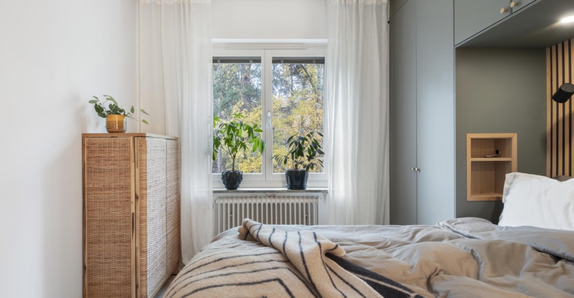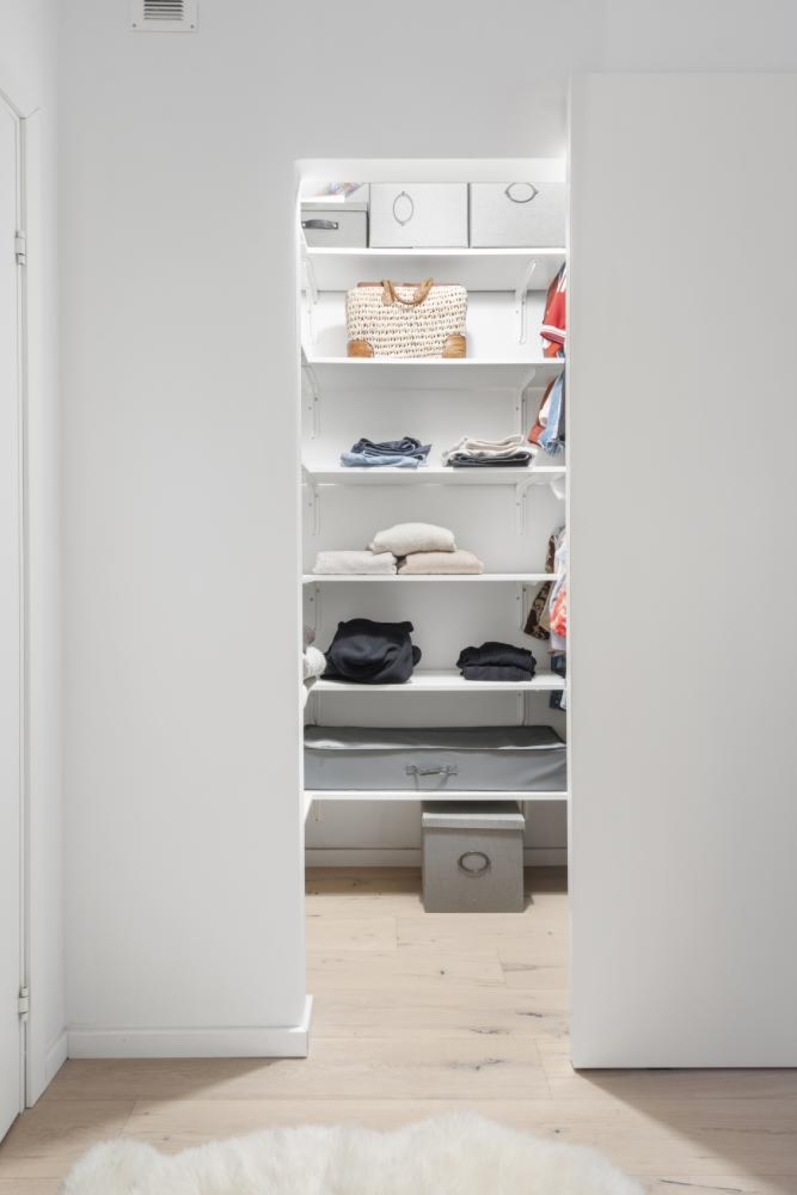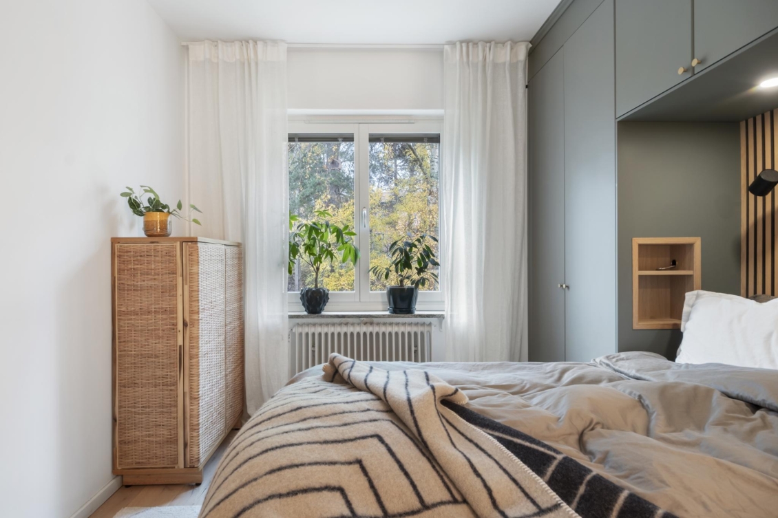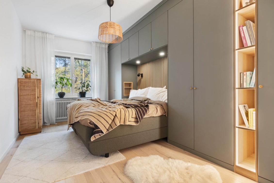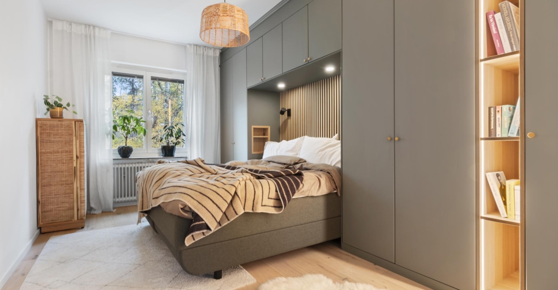 Bostaden erbjuder två rymliga sovrum med gott om förvaring. Master bedroom har en skräddarsydd platsbyggd garderobslösning runt sängen med infällda sängbord, integrerad belysning och smarta eluttag – en elegant och funktionell lösning som maximerar utrymmet. Det finns ytterligare förvaring i den inbyggda garderoben. Det andra sovrummet lämpar sig utmärkt som barnrum, gästrum eller arbetsrum. Breda plankgolv i båda och ljus färgsättning.