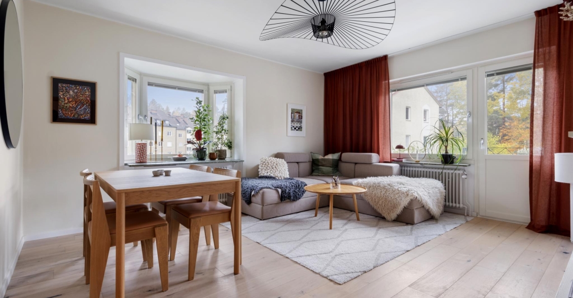 Det luftiga vardagsrummet har plats för både soffgrupp och matbord. De breda plankgolven och den moderna färgsättningen skapar en varm och inbjudande känsla. Från rummet nås den härliga balkongen med soligt läge – en idealisk plats för en lunch i solen eller en avkopplande kväll med utsikt.