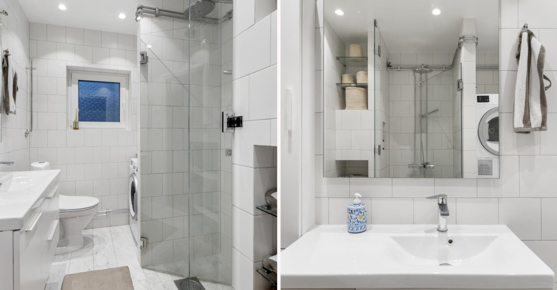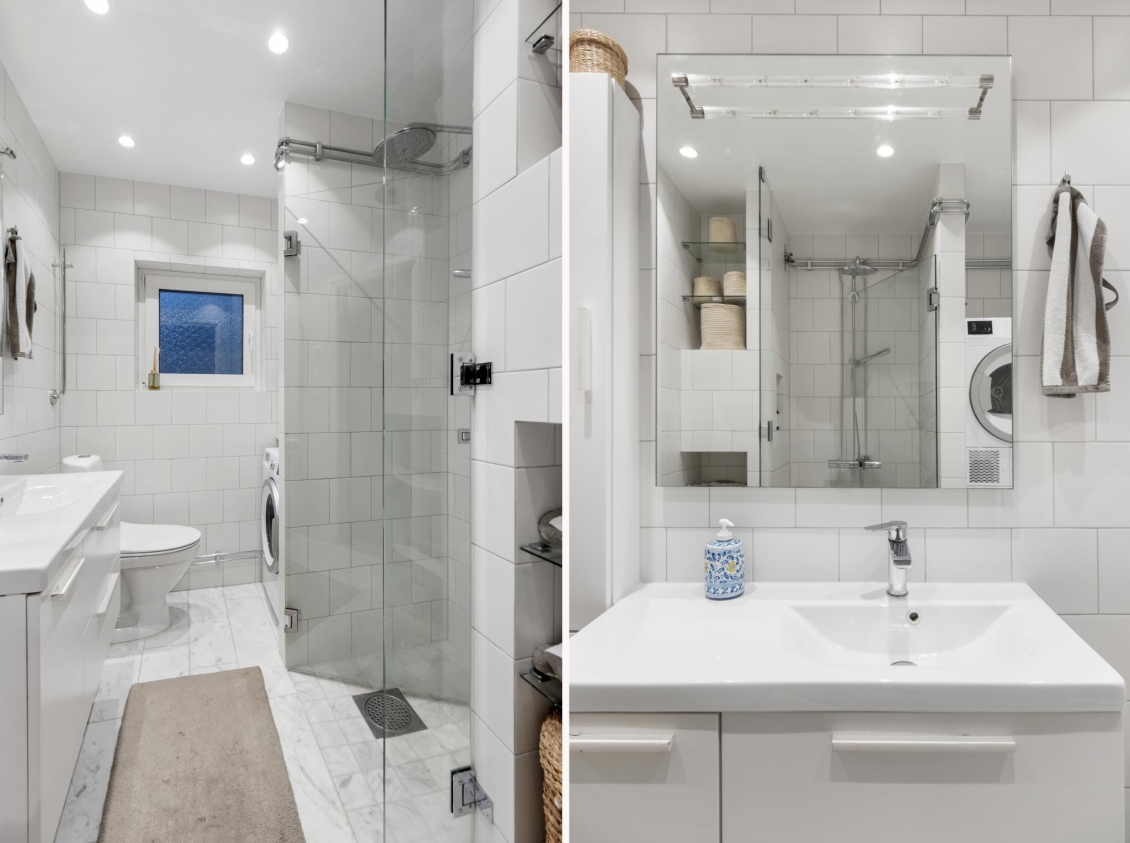 Badrummet, renoverat 2016, håller hög standard med takdusch, golvvärme och en praktisk tvättpelare som underlättar vardagen. Ljusa materialval och stilrena detaljer så som det lyxiga marmorgolvet skapar en fräsch och modern känsla.